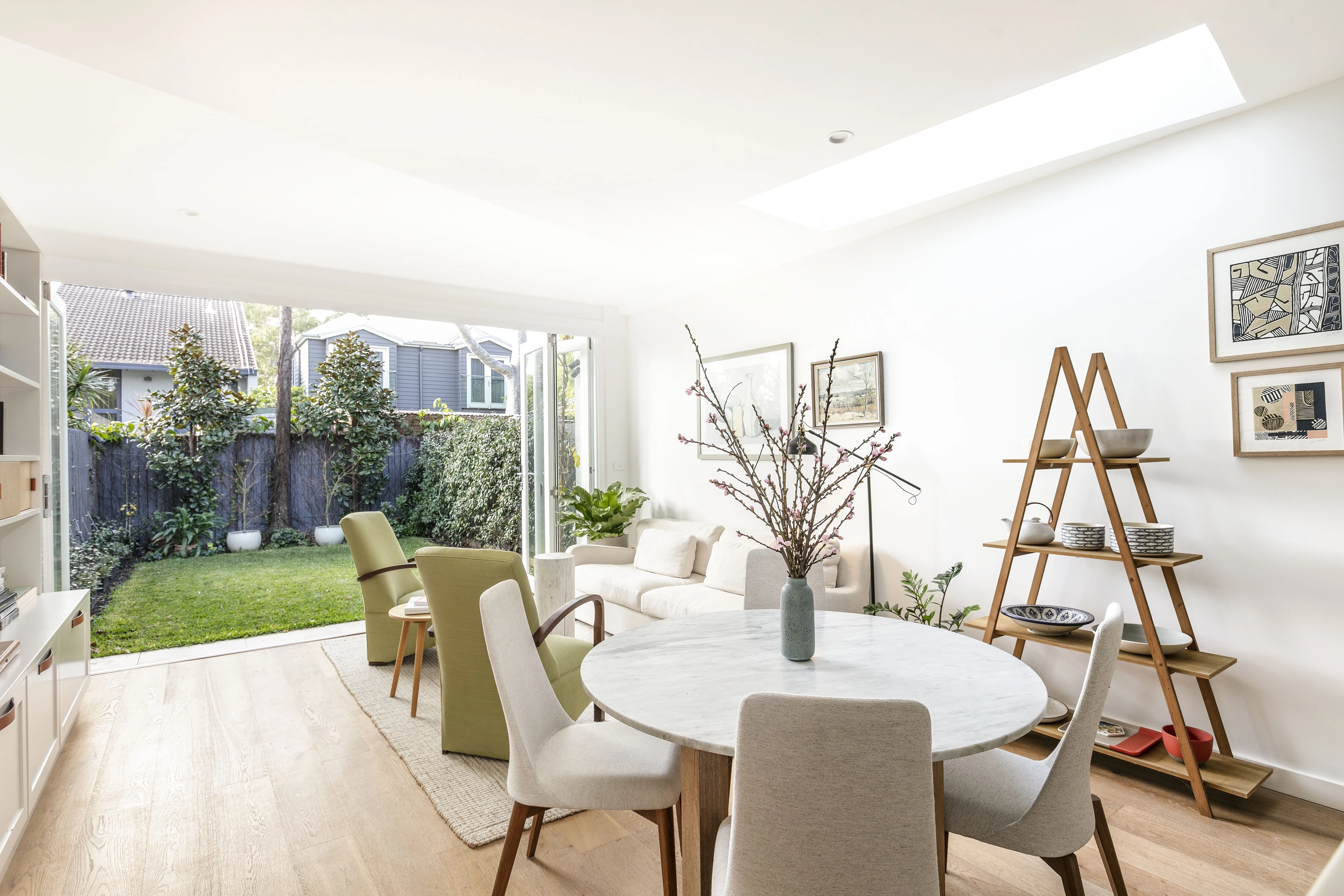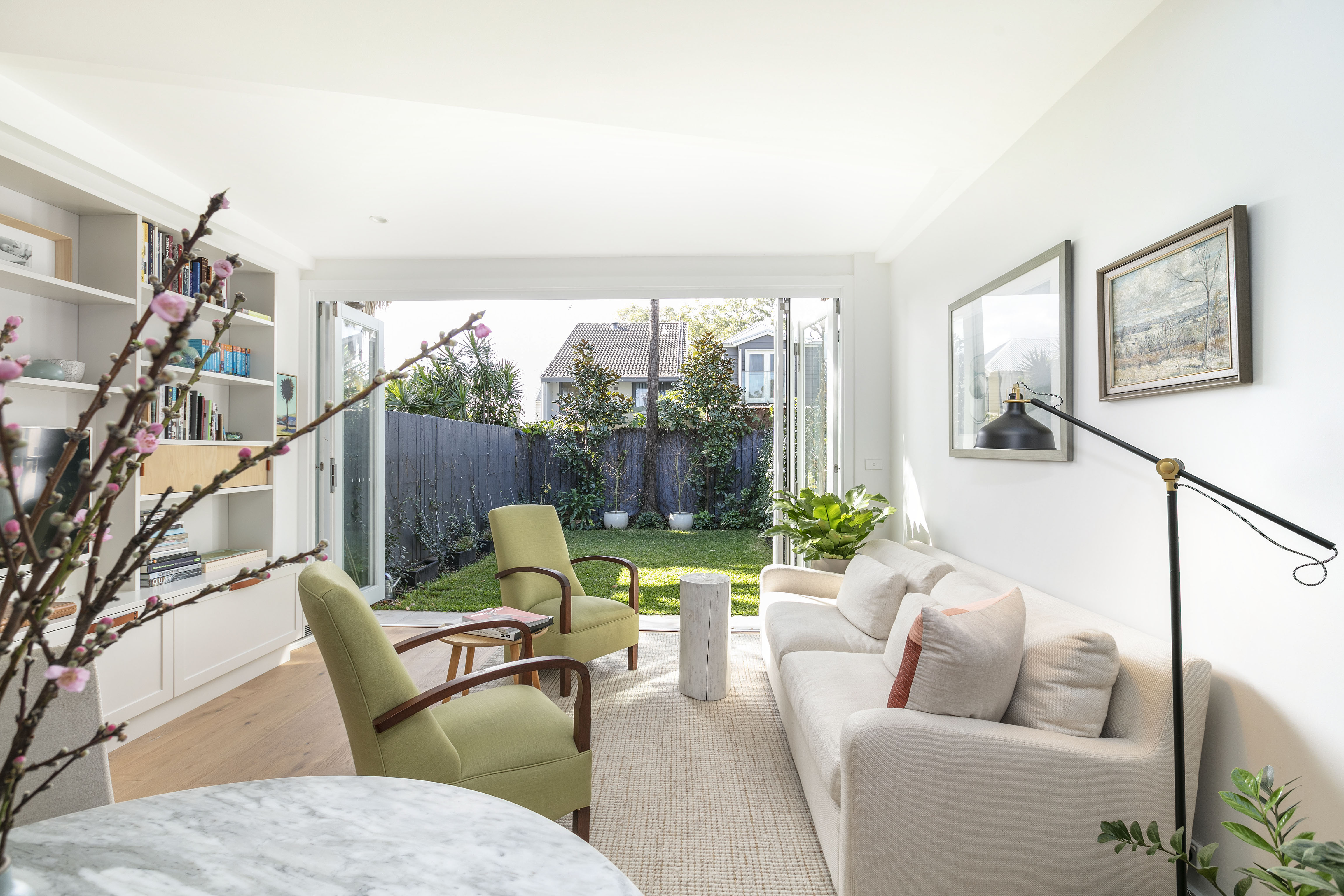 - Concertina doors to a green-fringed yard