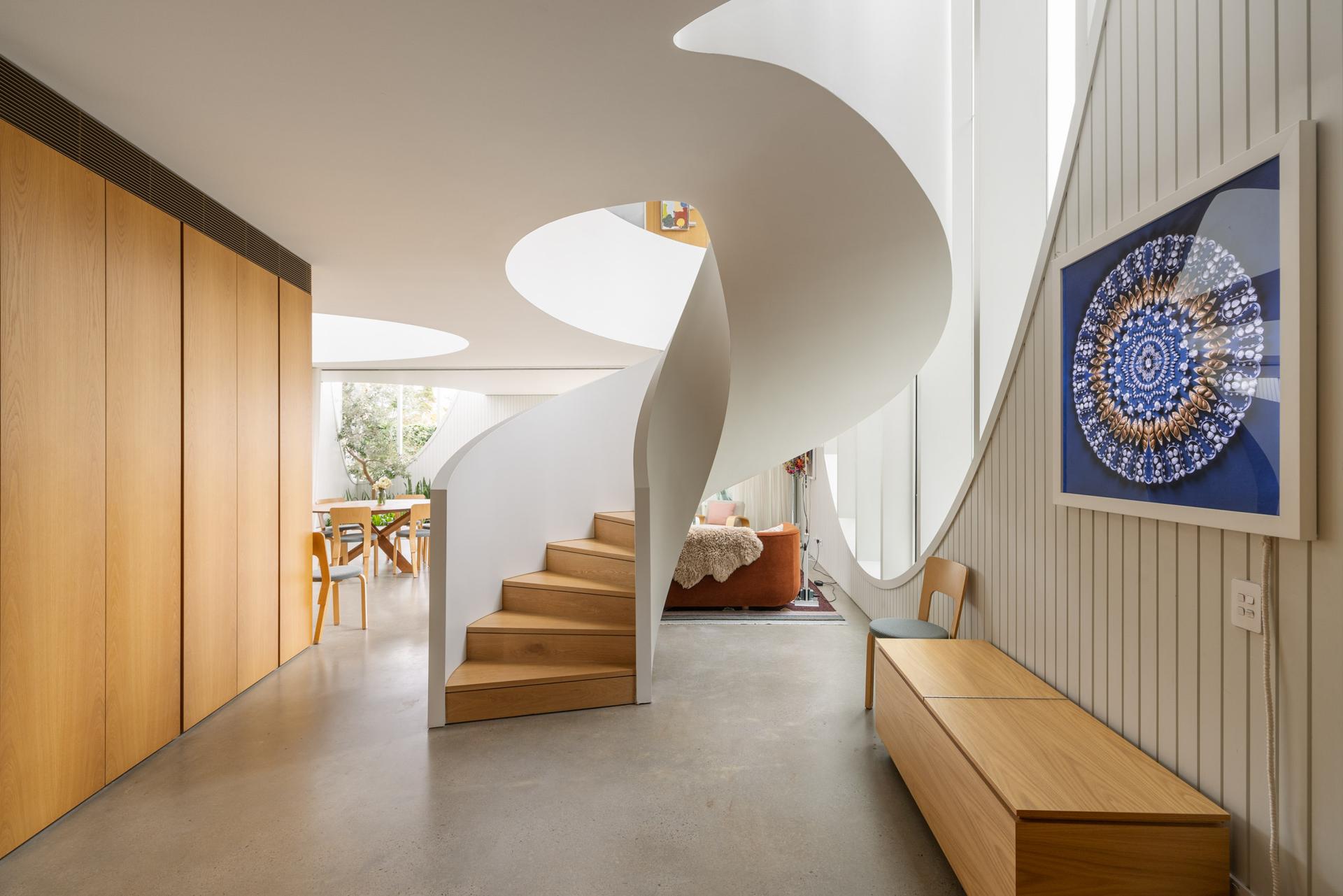 - A spiral staircase follows the curved form