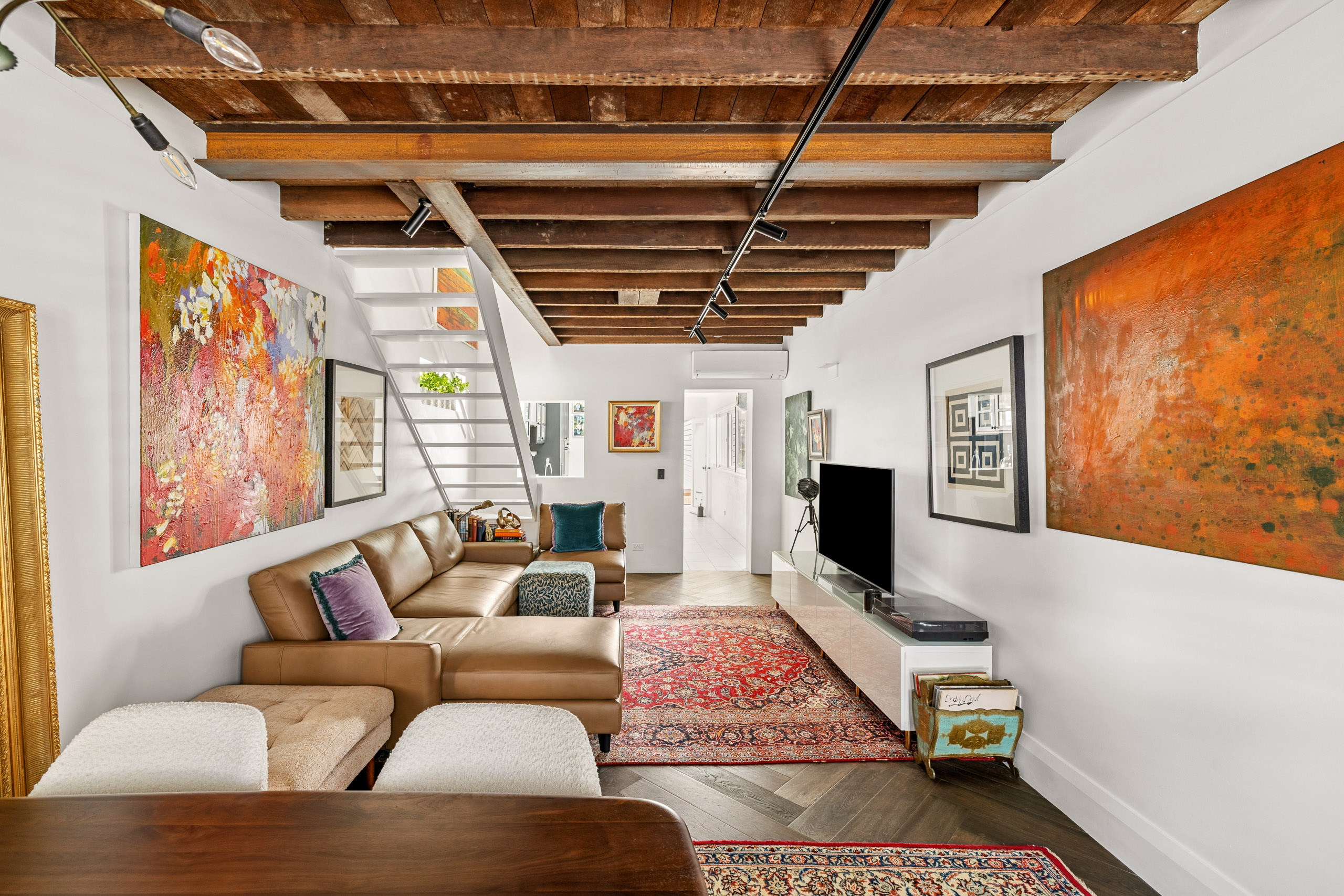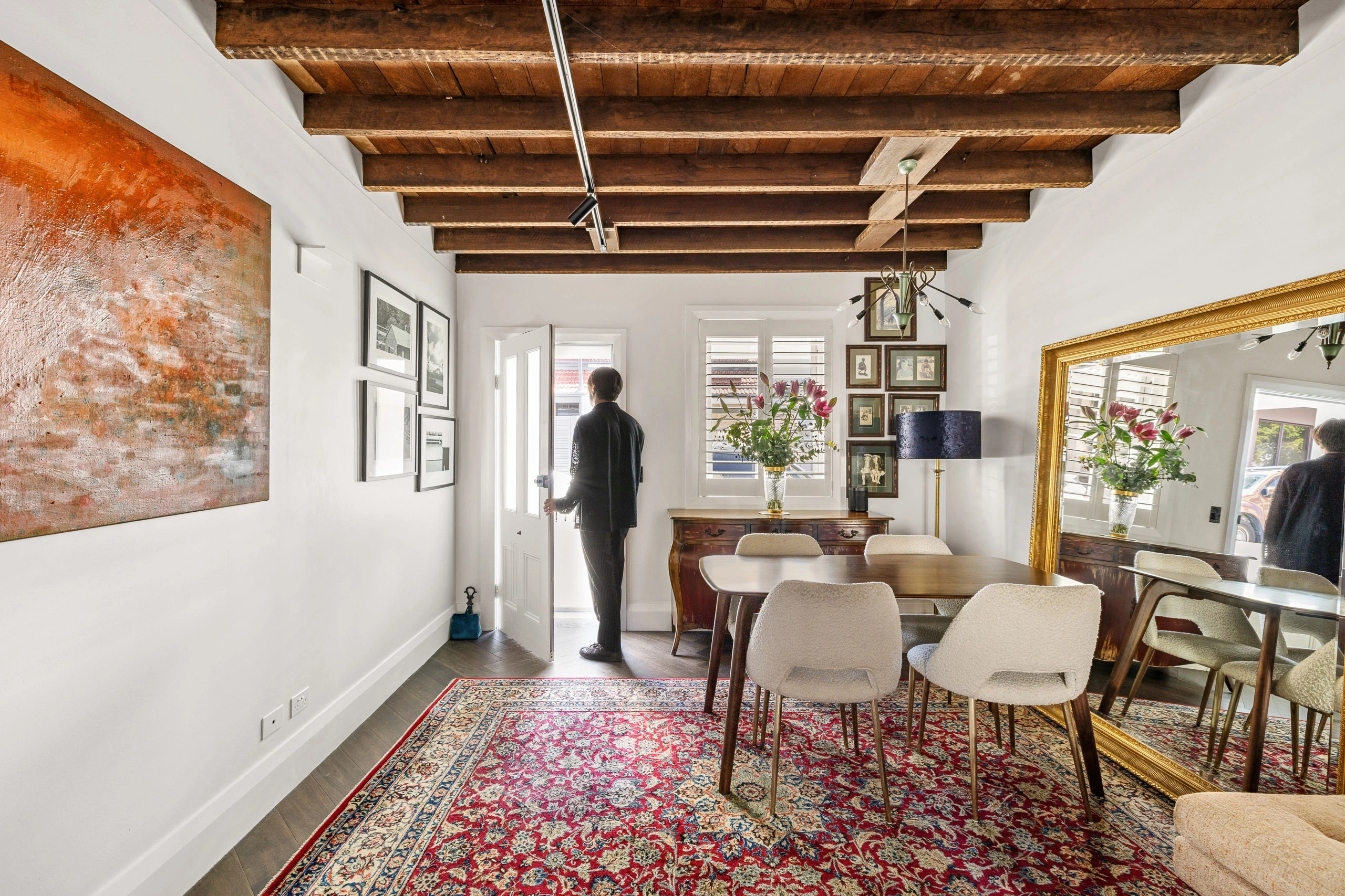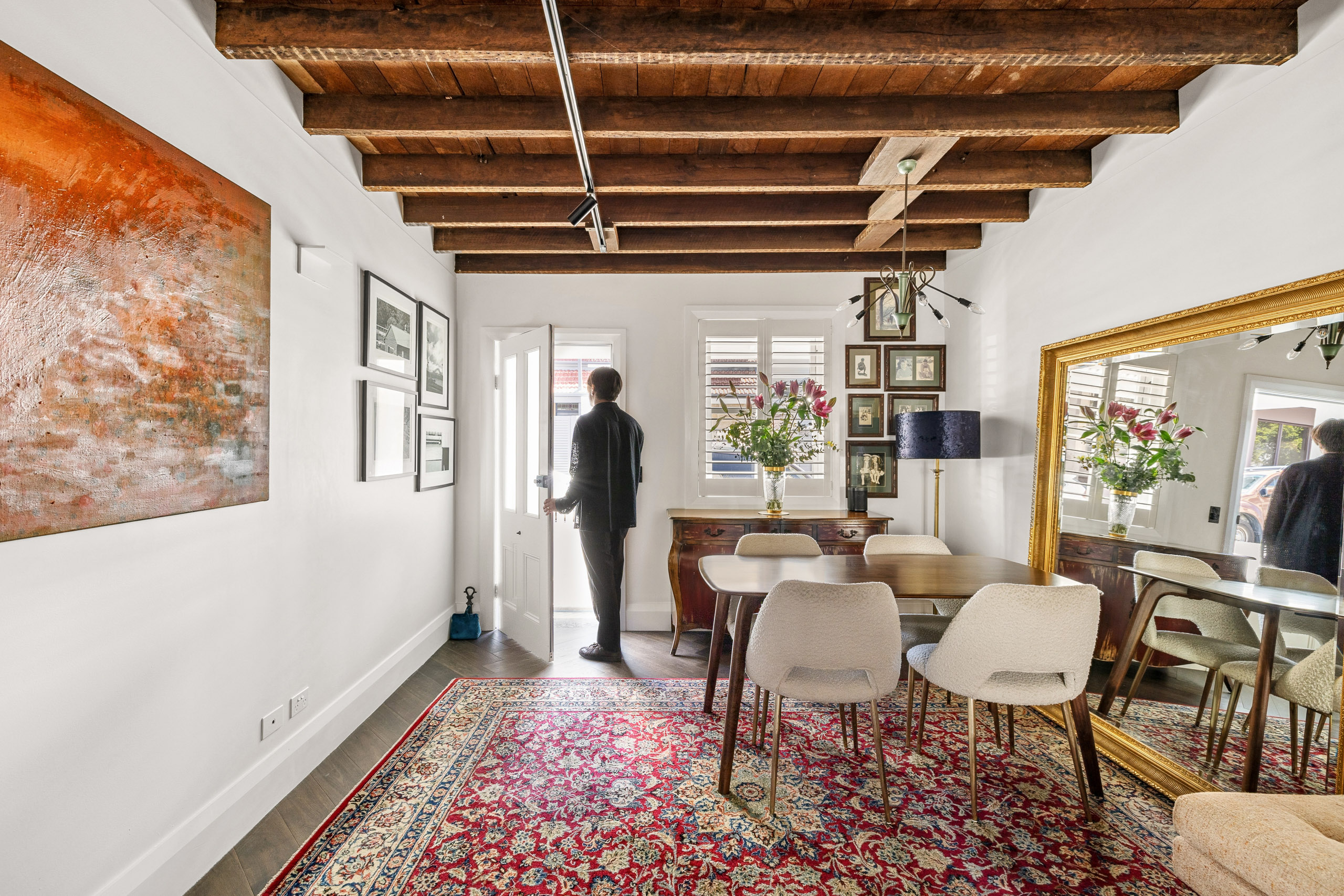 - Open living/dining with timber beam ceilings