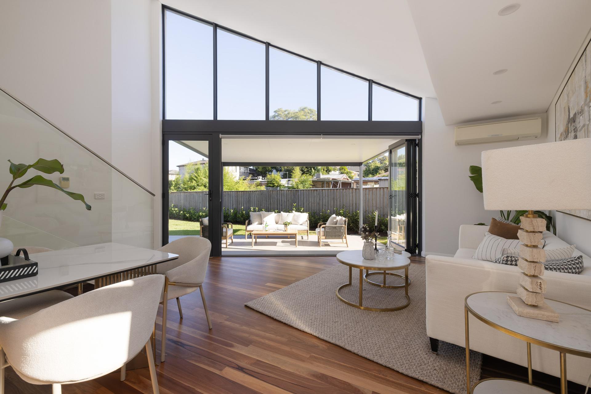 - Wood floors, glass bifold doors, air con