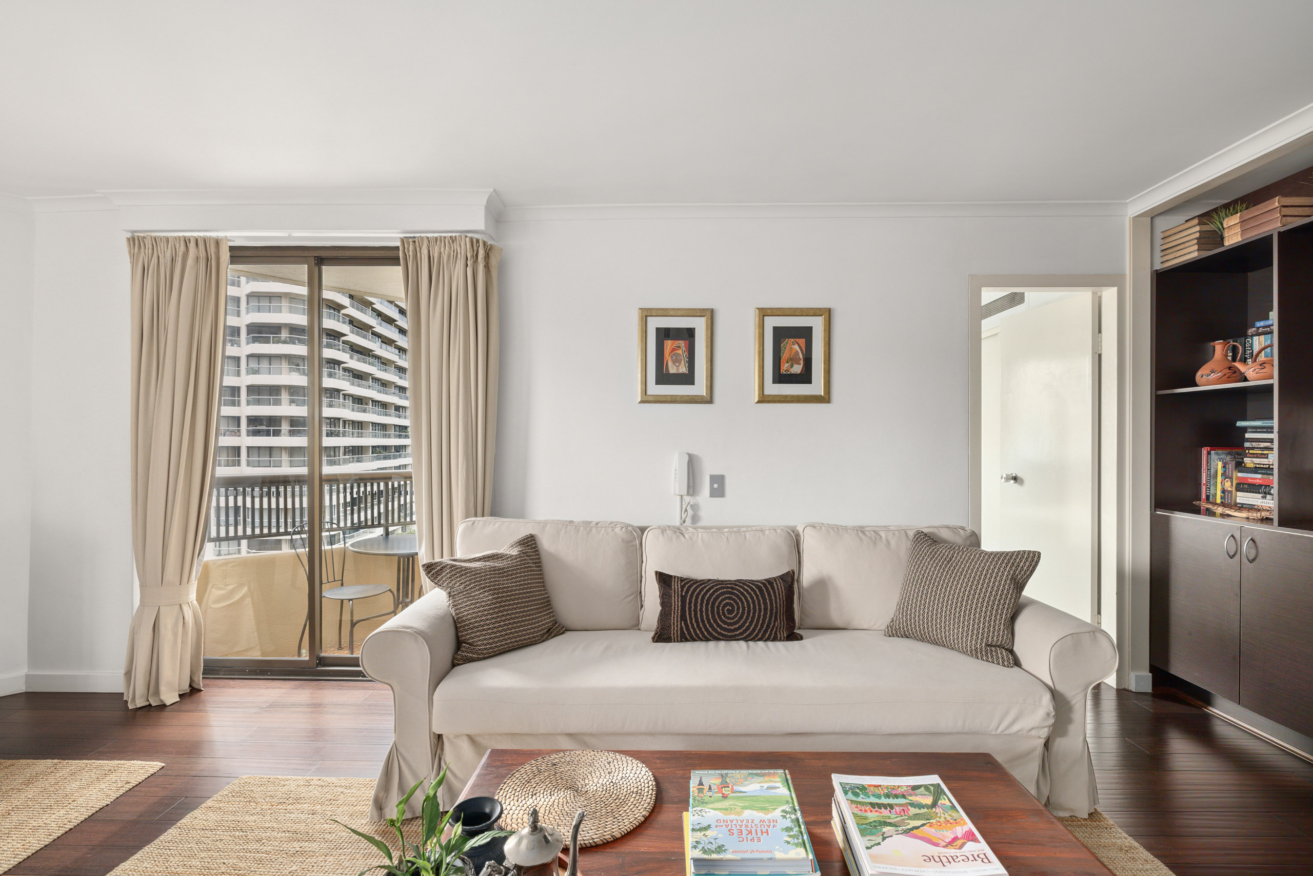 - Open living, dual balconies, floorboards