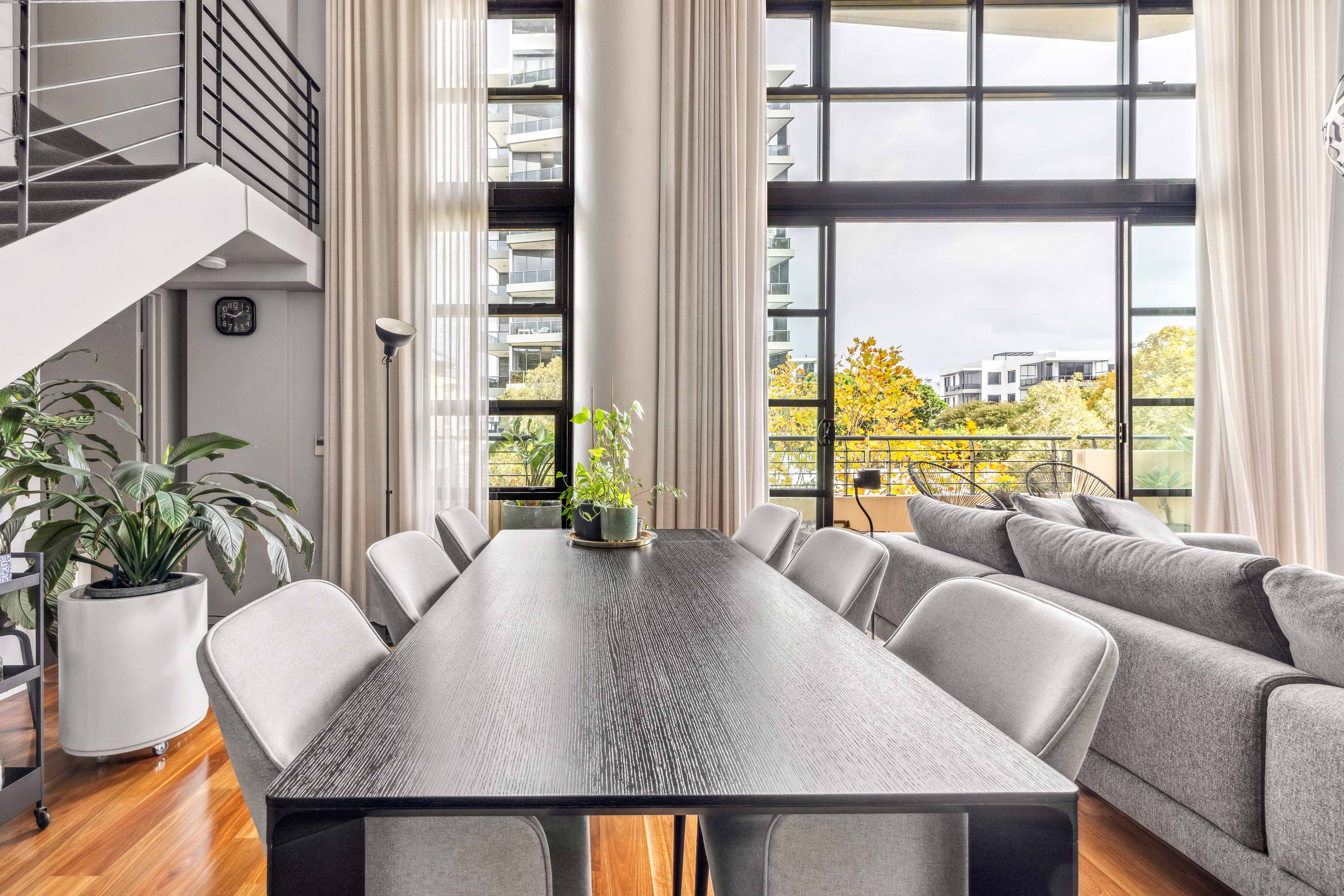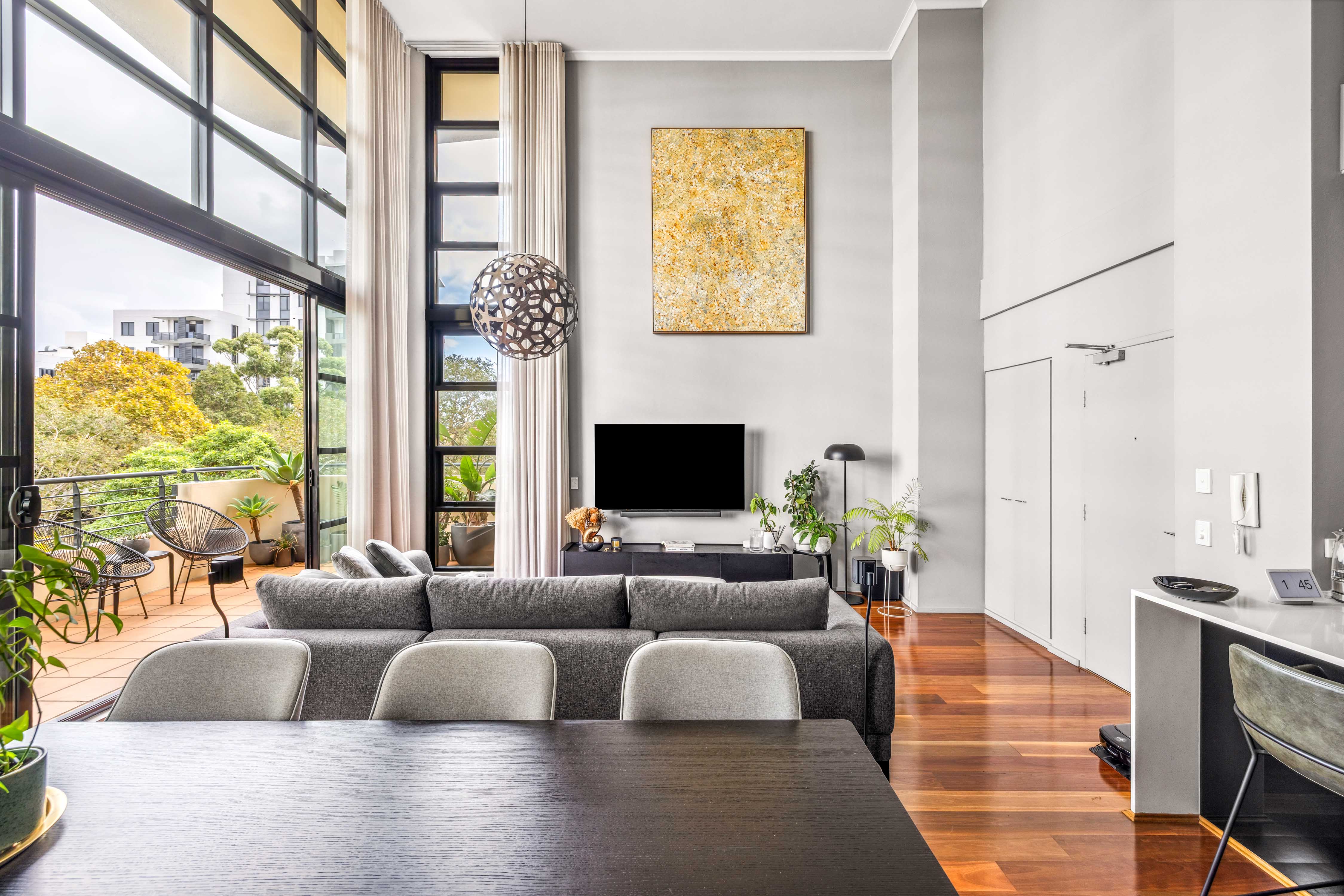 In the award-winning Moore Park Gardens precinct, this residence in the ‘Caley Apartments’ delivers a bold and sophisticated take on city living. With soaring 5.5m ceilings, oversized proportions, and wraparound glass, it blends volume and privacy with luxe finishes and lifestyle amenities. A full-service building with on-site management, pool, gym and parking, it’s a complete urban retreat.