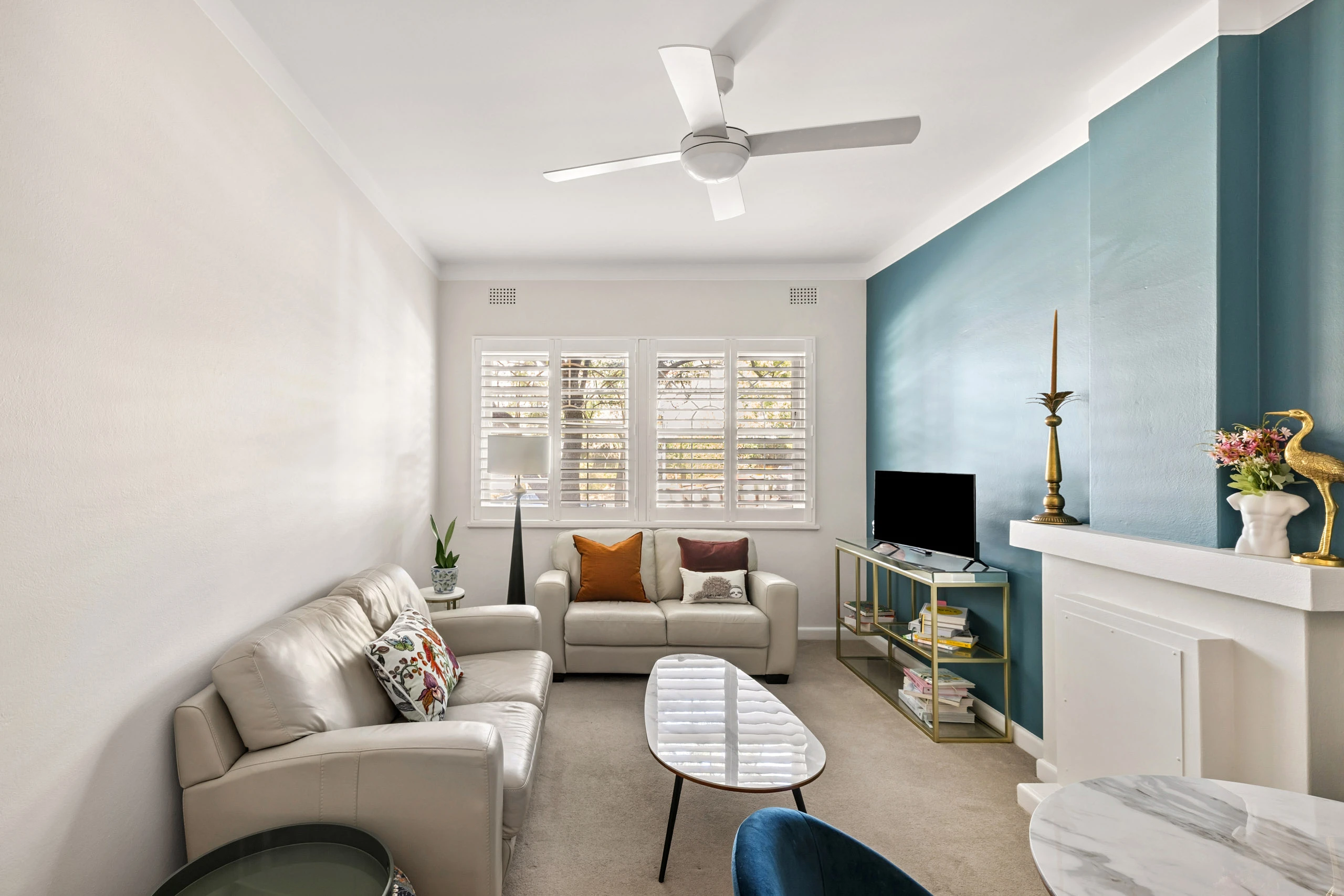 - Open living, ceiling fans, window shutters