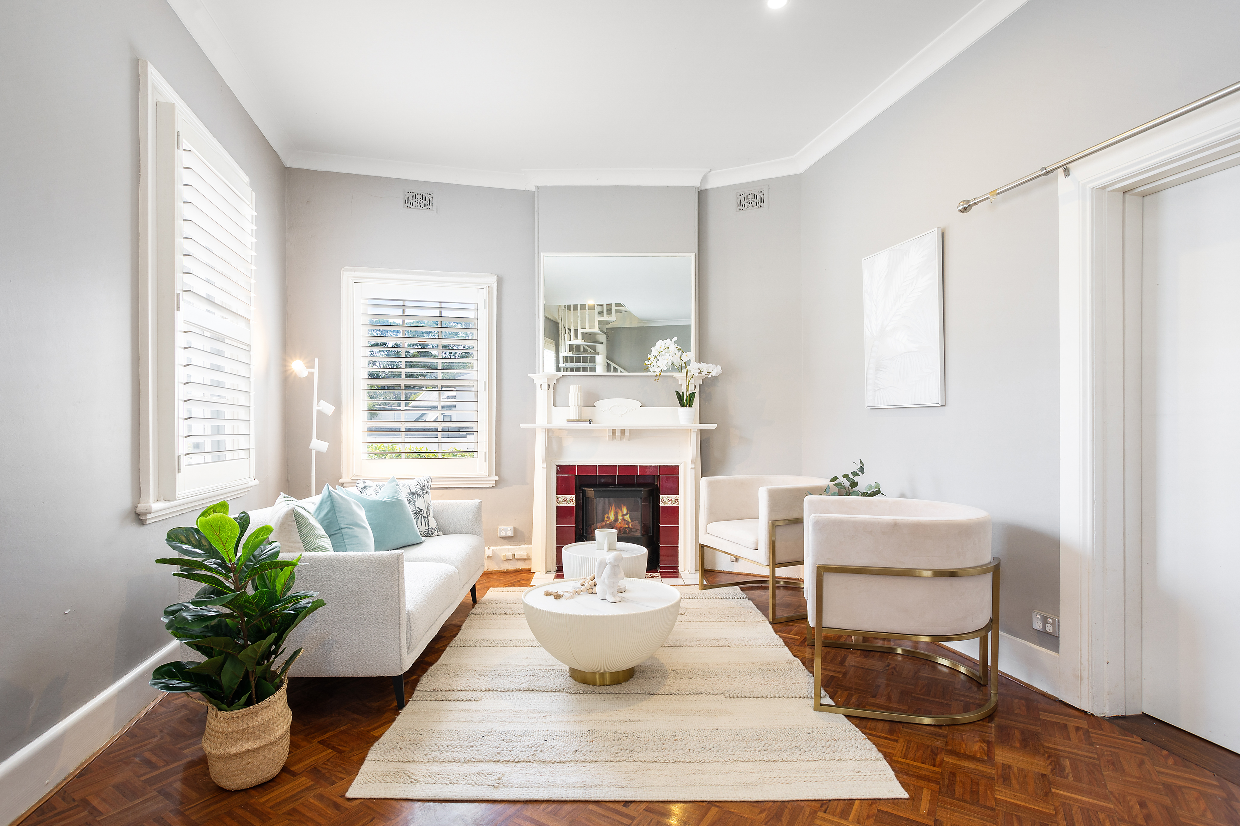 - Parquetry flooring, fireplace