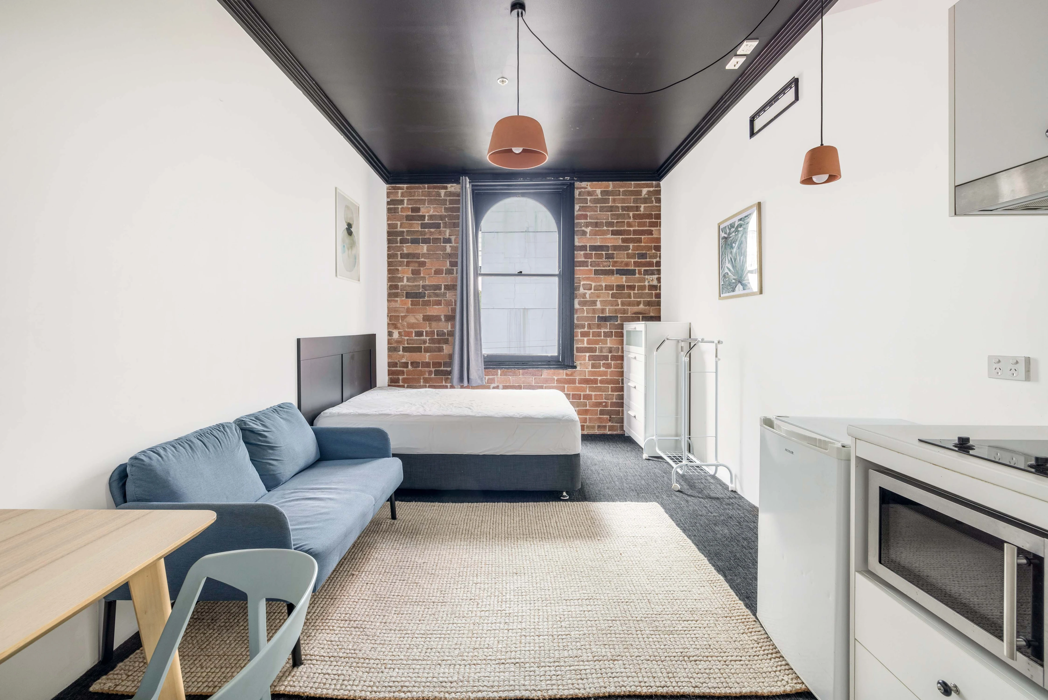 - Large bay windows & exposed brick