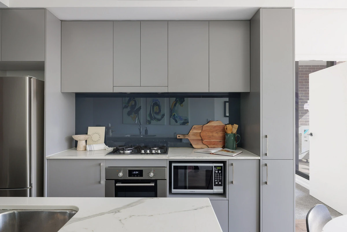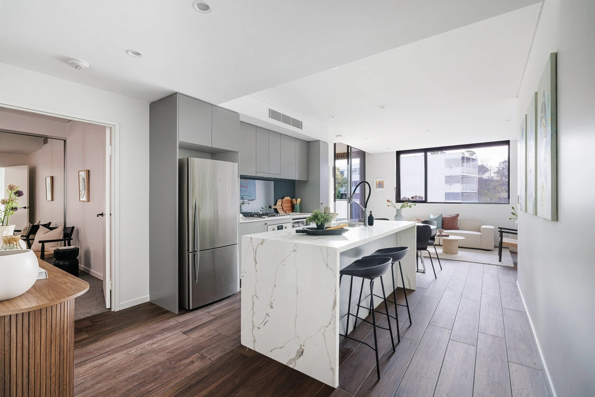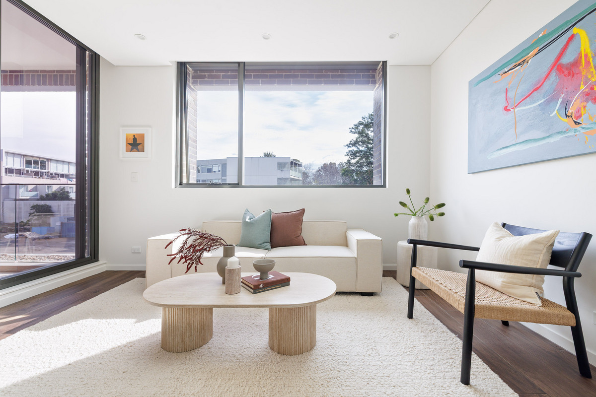 With an elevated position in its laneway setting, this apartment has a sense of tucked-away privacy. The open living space is anchored by a large kitchen island, with ample space for additional dining and lounge zones. The main bedroom has a private ensuite, walk-in robe and balcony access. It’s a short walk to the green expanse of Sydney Park, train stations, Erskineville Public School, local cafés, and the surrounding hubs of Newtown, Erskineville and Alexandria.