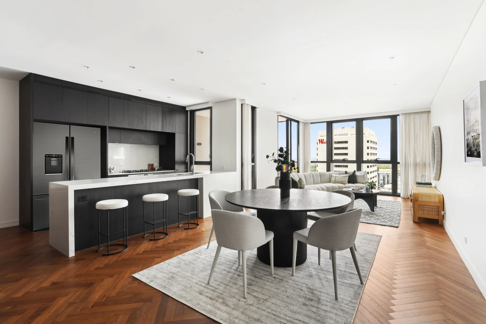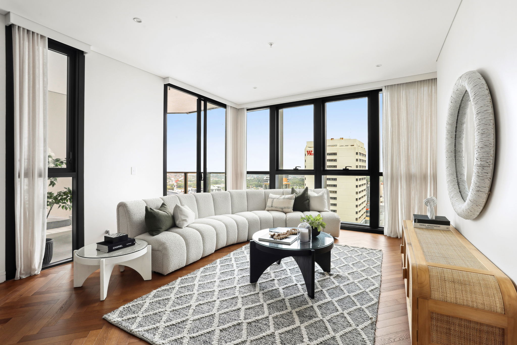 Positioned high within one of Bondi Junction’s most acclaimed new landmarks, this exceptional sub-penthouse defines elevated urban luxury. Framed by floor-to-ceiling glass, its bold architectural form captures panoramic views from the city skyline and Harbour Bridge to Botany Bay. Two expansive terraces enhance the open living zones, with high-spec finishes and a sun-drenched westerly aspect throughout.