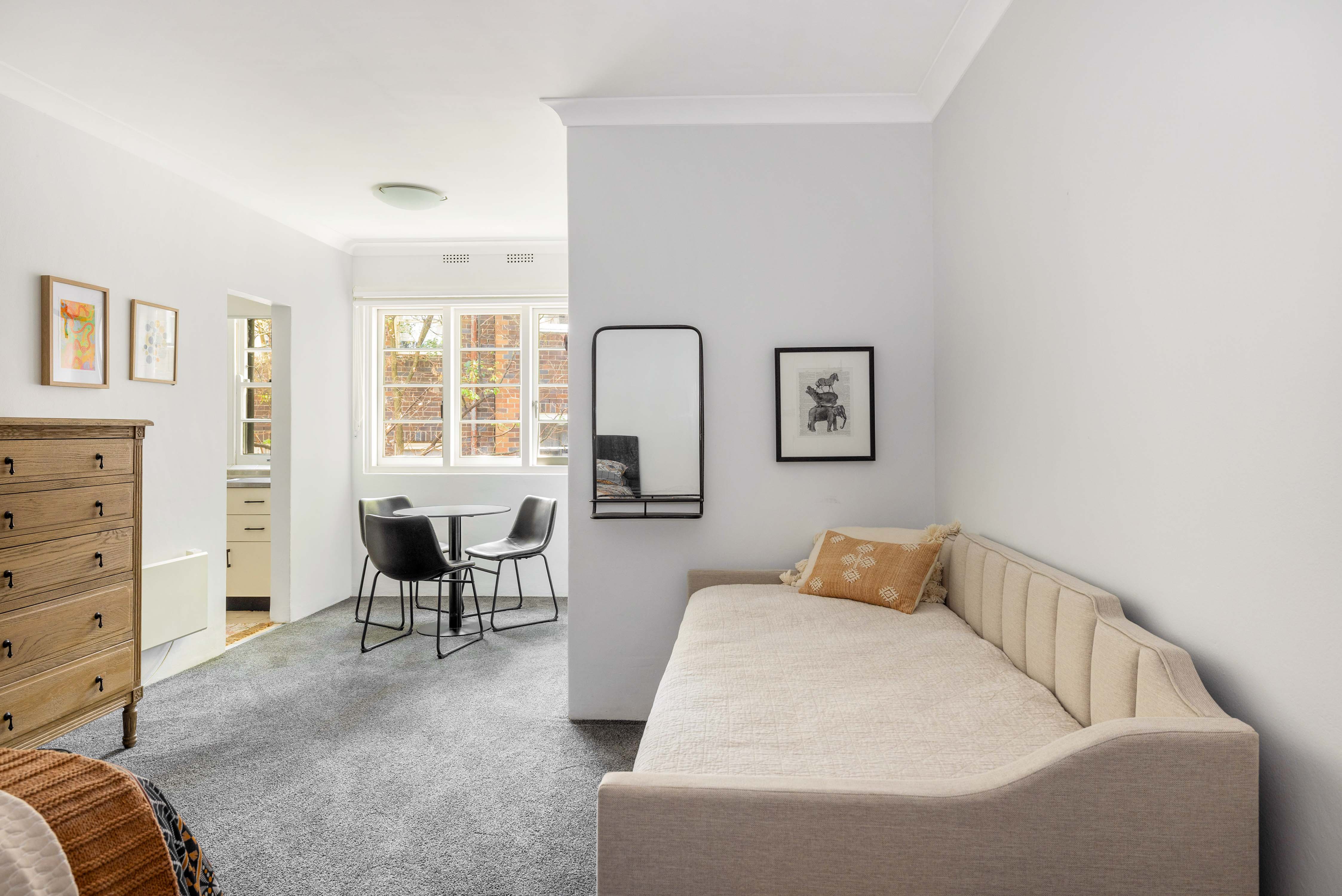In a quiet cul-de-sac close to the heart of Macleay St, this top-floor studio enjoys a bright northerly aspect and leafy courtyard outlook. It's a solid entry to cool inner-city living and classic Art Deco character