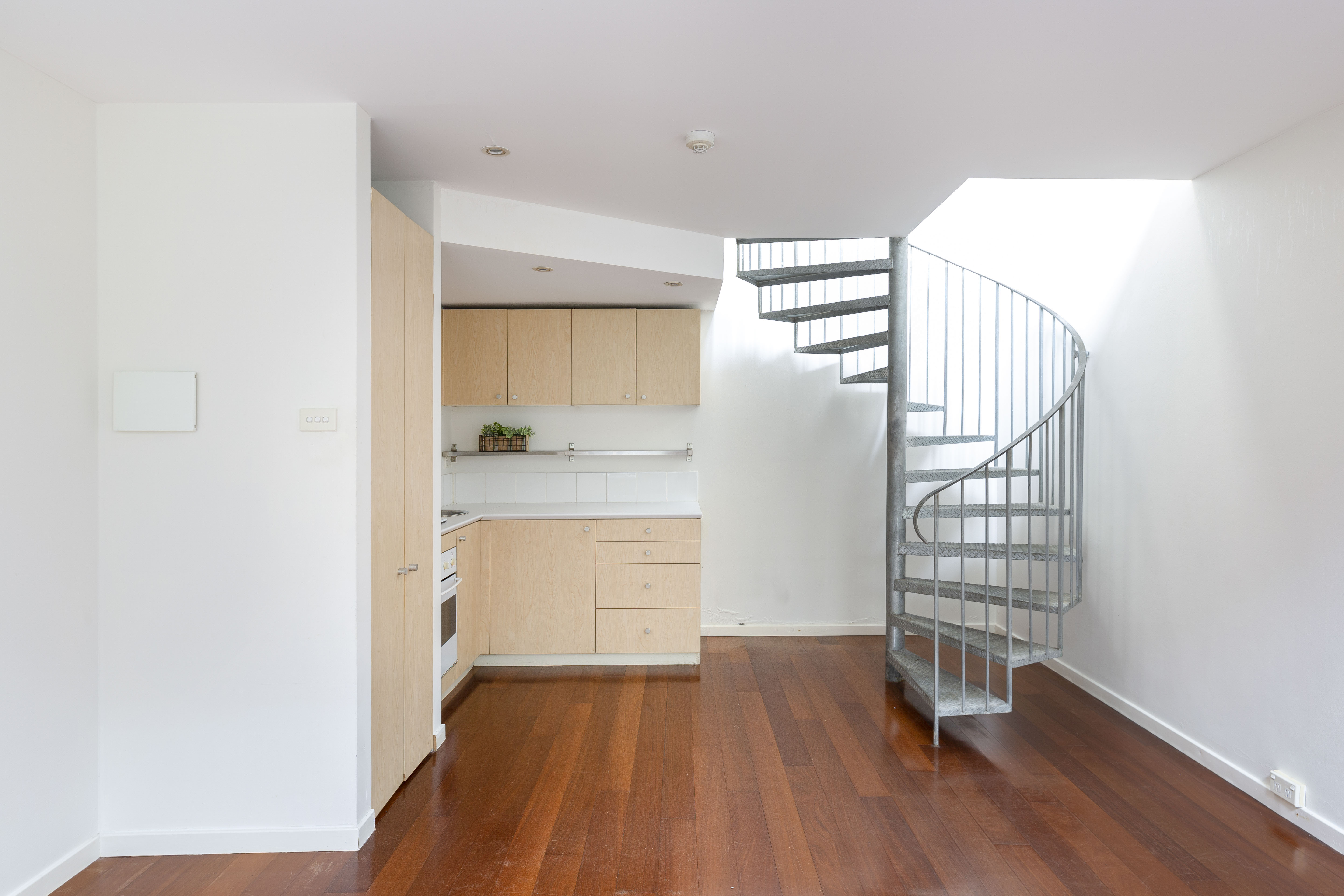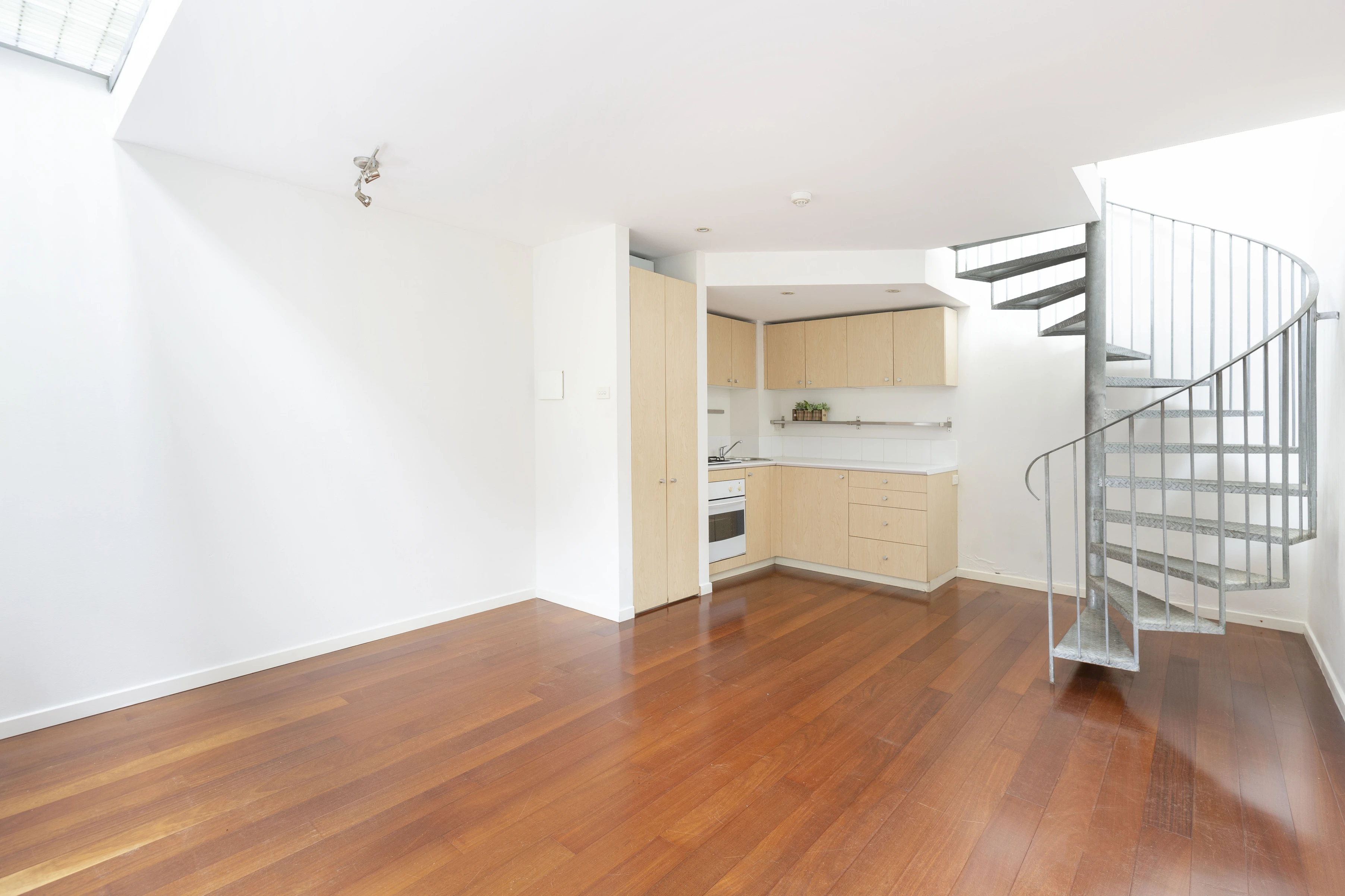 - Steel spiral stairs, light, bright interiors