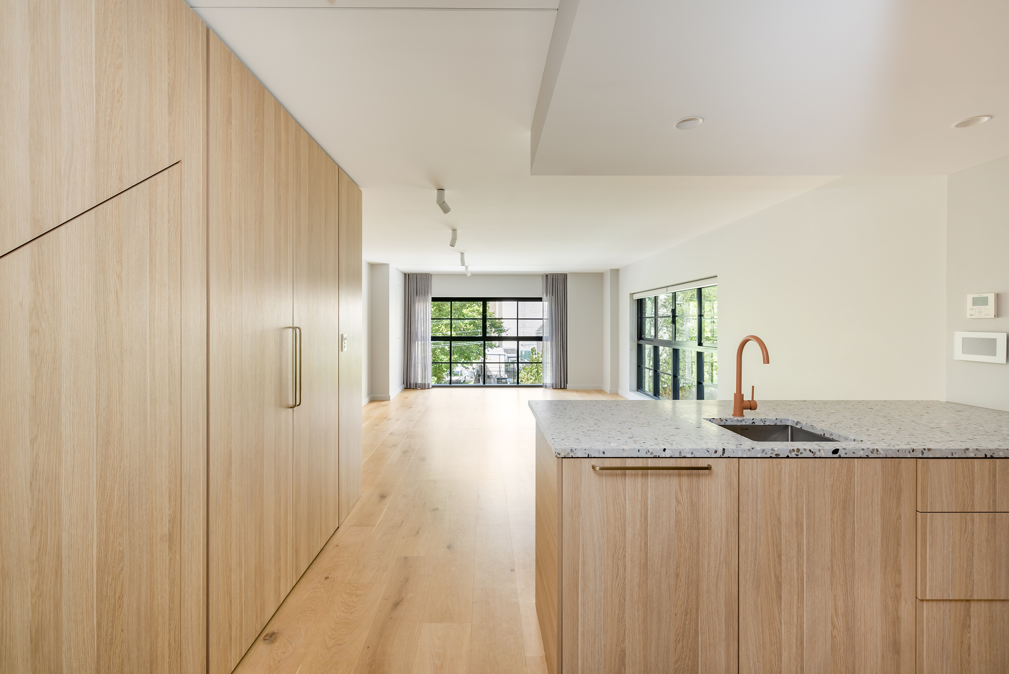 - Oak floorboards t/out, terrazzo benchtops