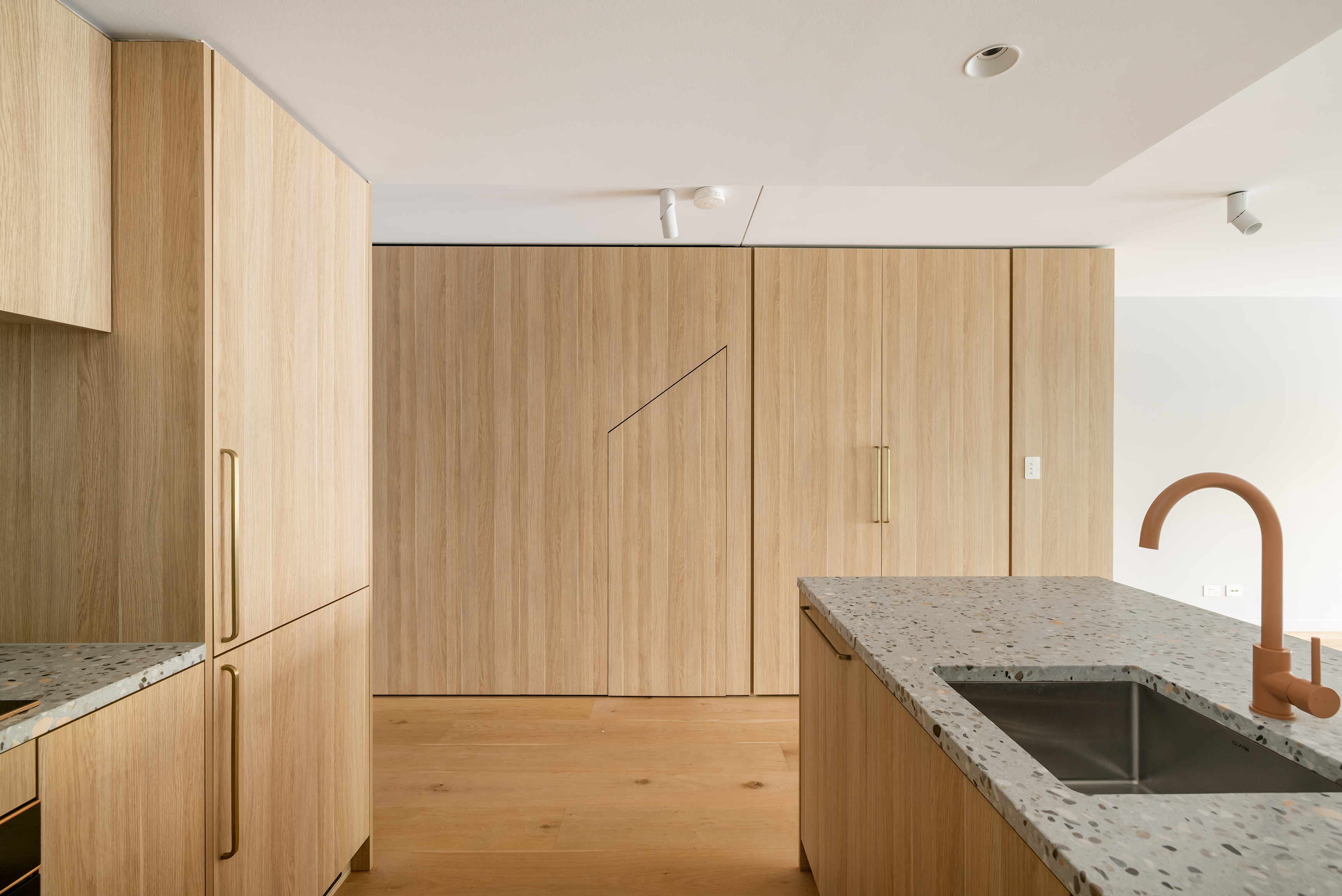 - Oak floorboards t/out, terrazzo benchtops