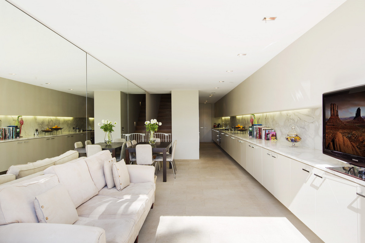 - Fluid living spaces, travertine floors