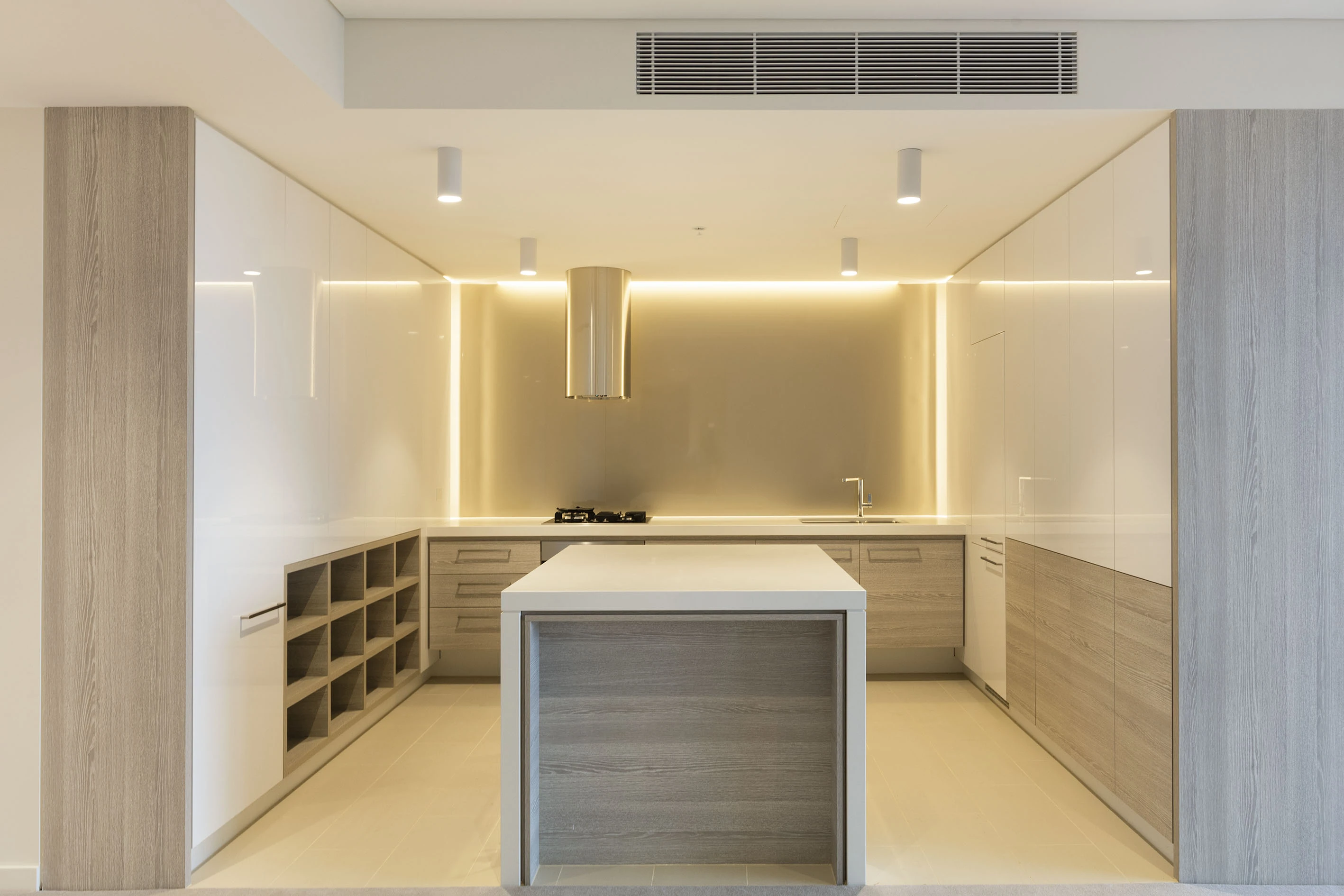 - Floor-to-ceiling glass, ducted AC t/out
