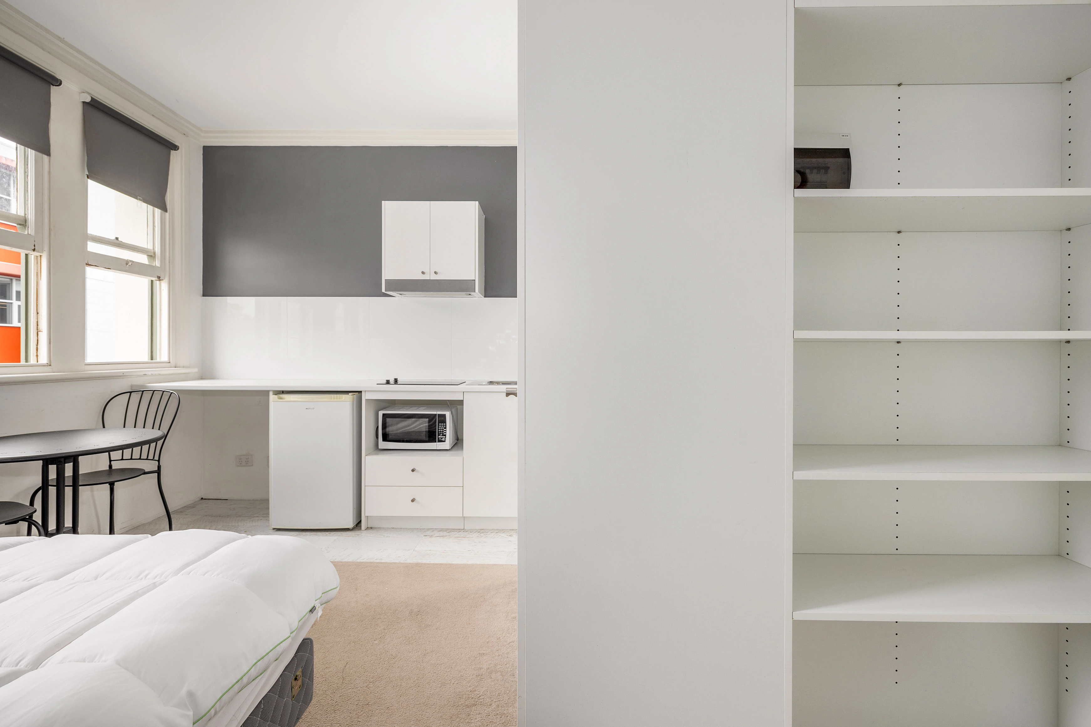 - Unfurnished, bar fridge included