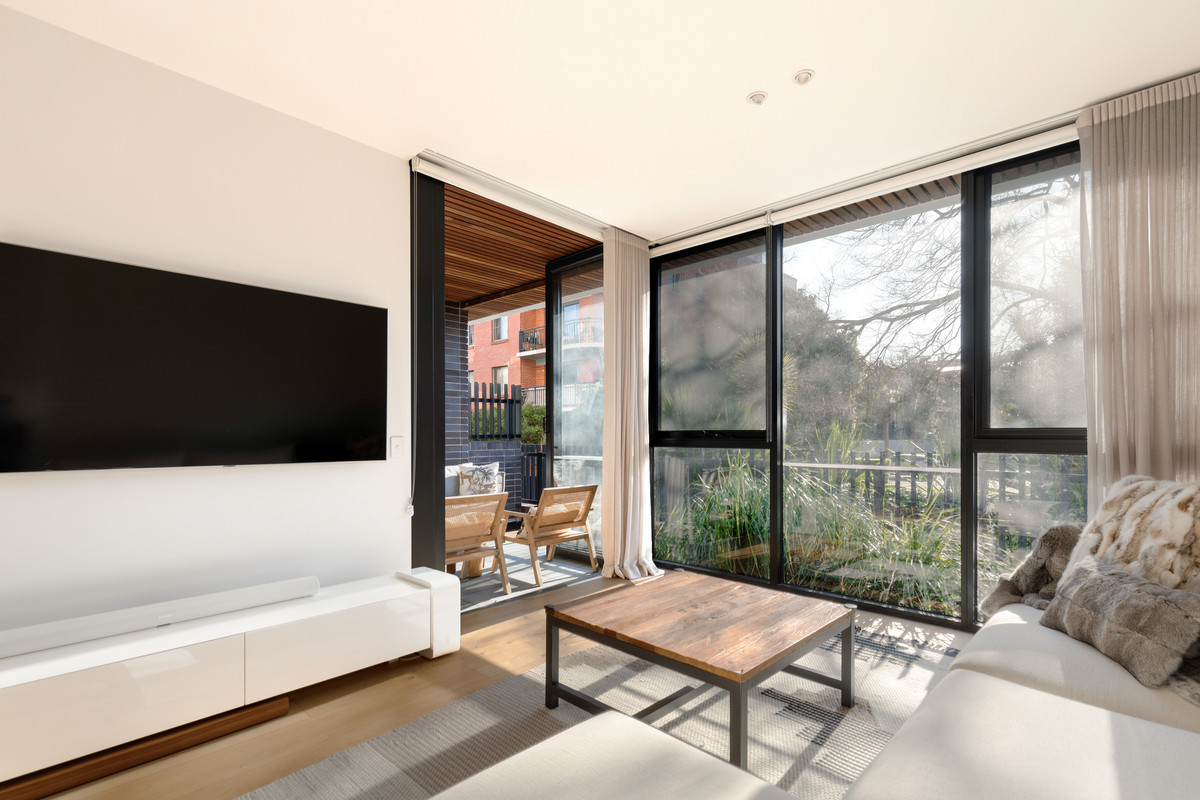 A light-filled ground floor apartment in 'Arkadia', this home is a design showpiece in an award-winning building on the edge of Sydney Park, showcasing well-considered details plus community-focused amenities including a rooftop with barbecues, kitchen gardens and city views.
