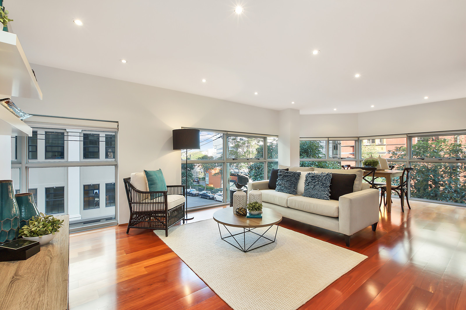 - Polished floorboards, sleek stone kitchen