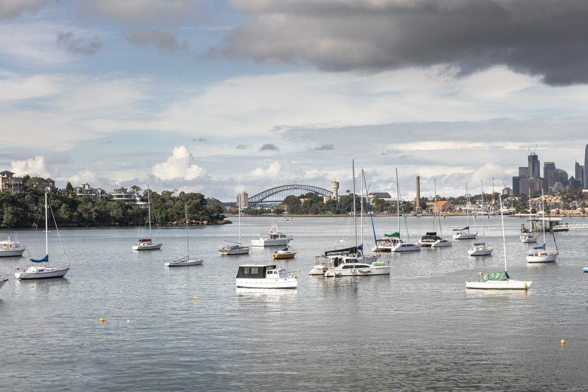 A corner position, this is one of the best north-facing aspects in the building. It overlooks waterfront lawns & Drummoyne Bay. The city skyline and Harbour Bridge feature in the background.