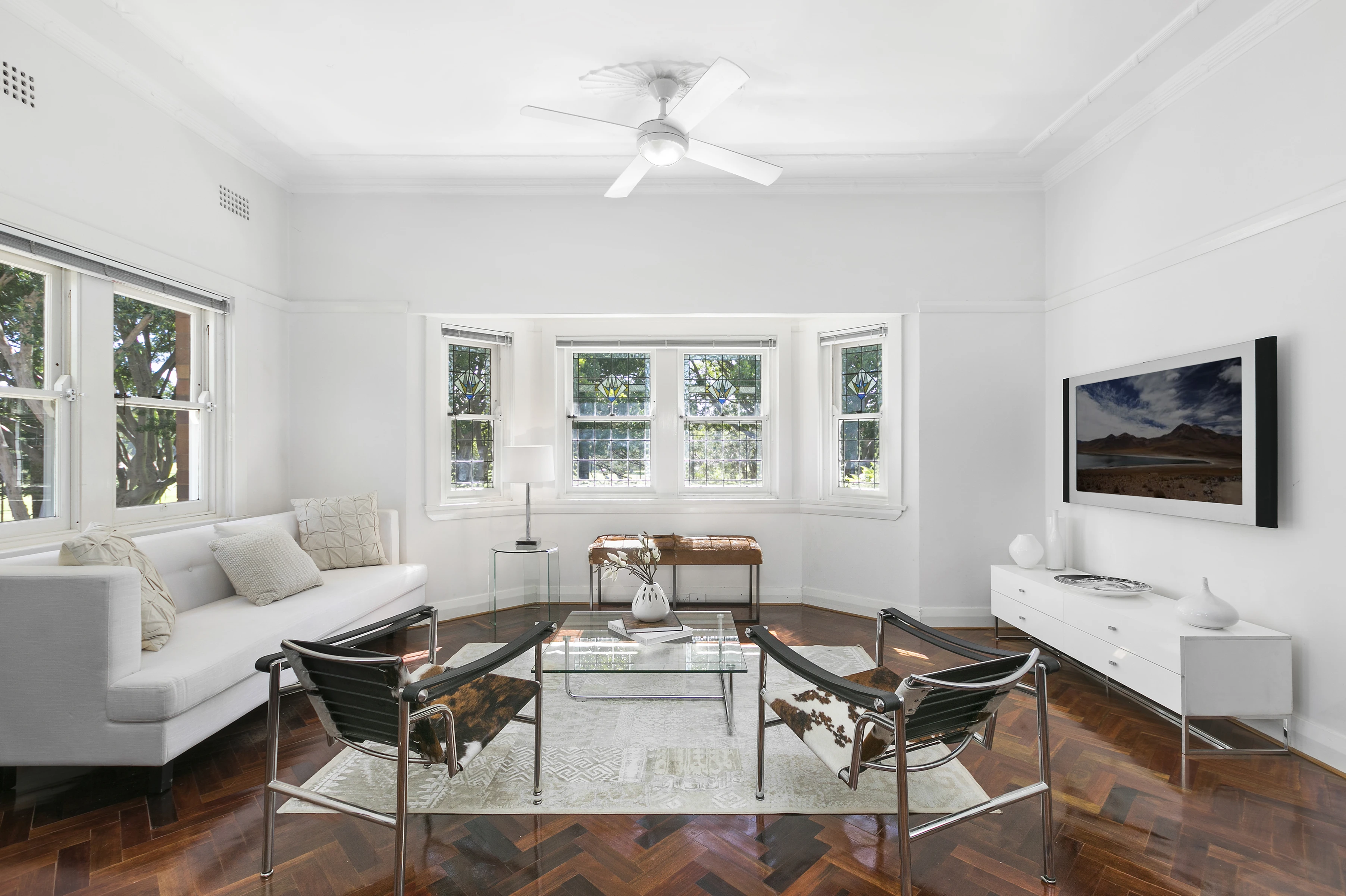 Ideally situated on the top floor of a boutique Art Deco building, this renovated two-bedroom apartment has golf course views and abundant natural light. The house-sized open-plan living includes a modern Miele kitchen and elegant bay window overlooking the green fairway. Interiors are graced with ornately detailed ceilings and herringbone parquet flooring, plus high-quality updates including ceiling fans, bathtub and internal laundry. Steps to Plumer Road village, local cafés/dining and the harbour-front promenade, and an easy stroll to Rose Bay village, schools and transport links.