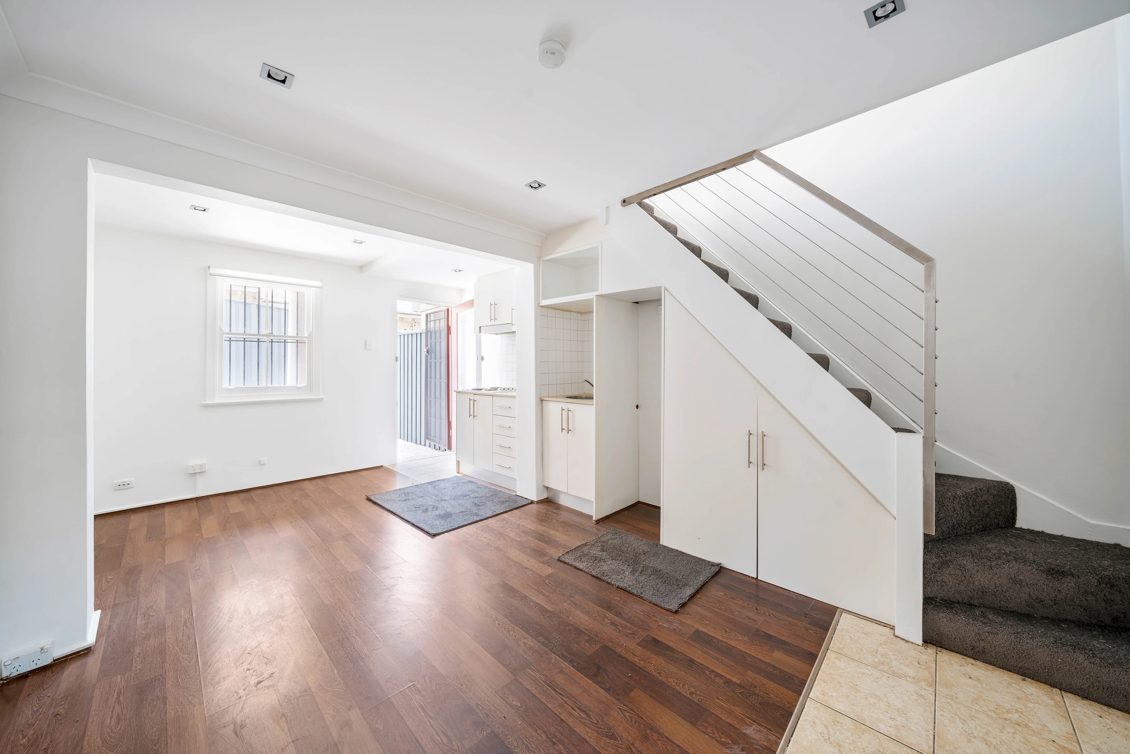 - Open living/dining area, timber floors