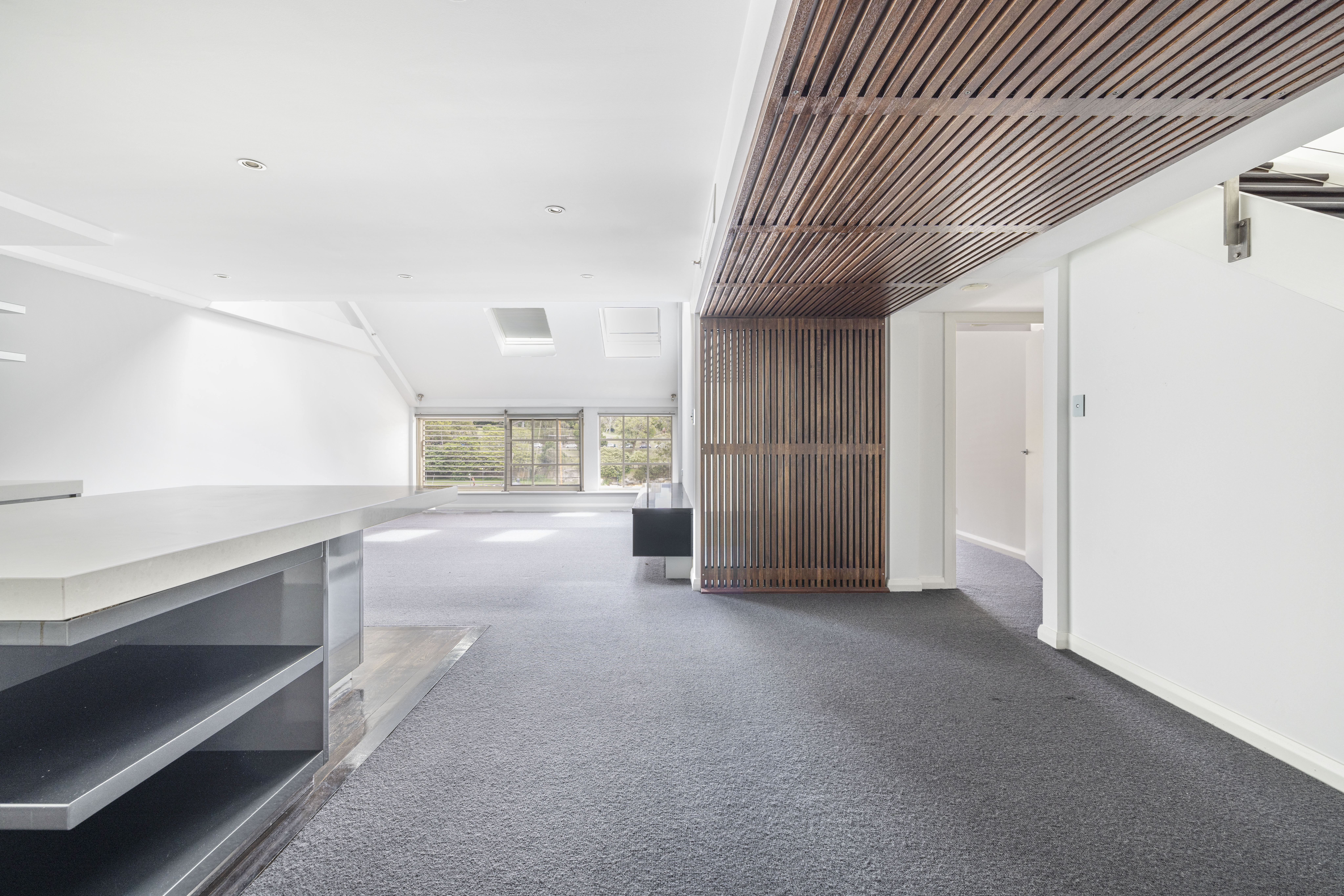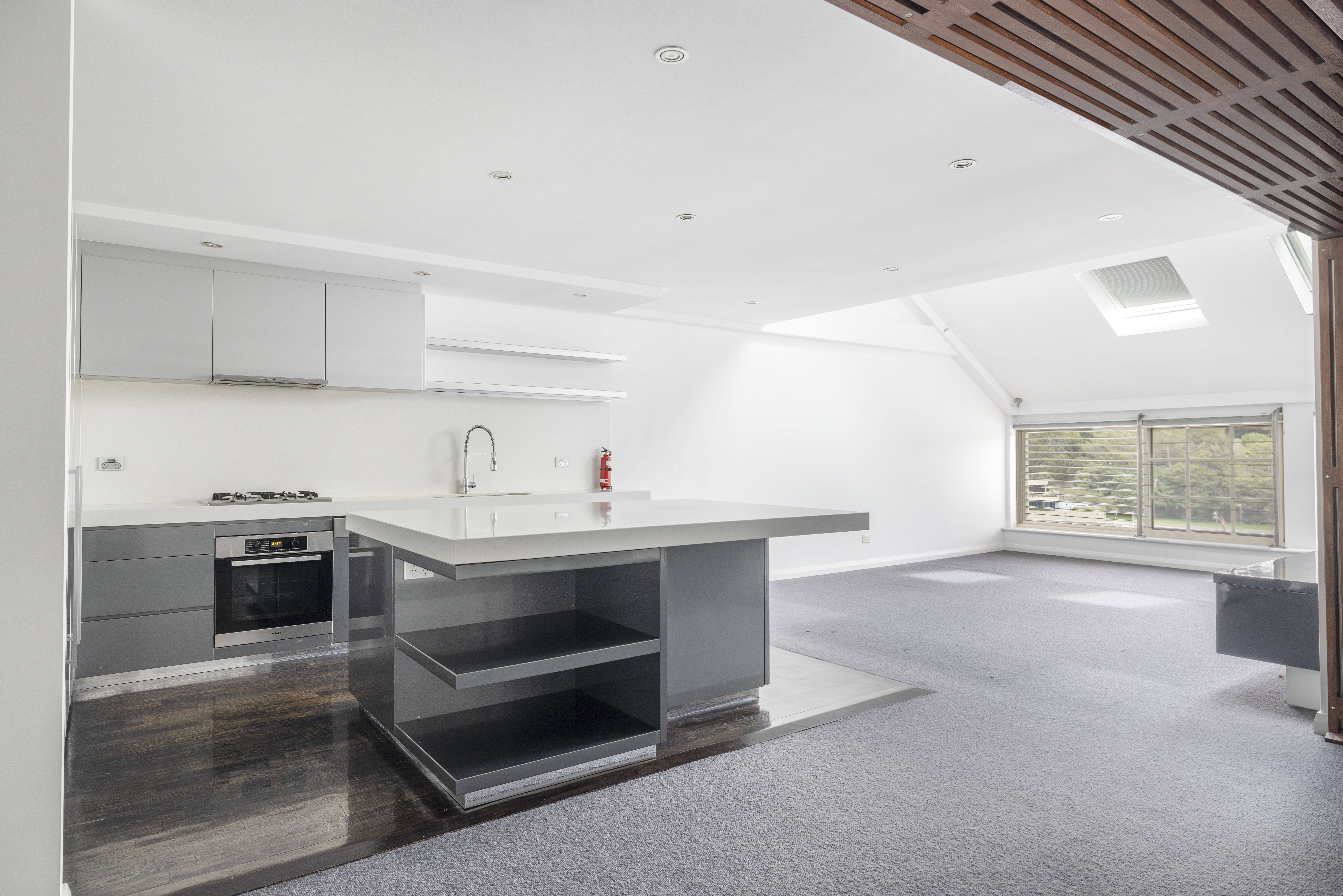 - Skylit open living, modern kitchen