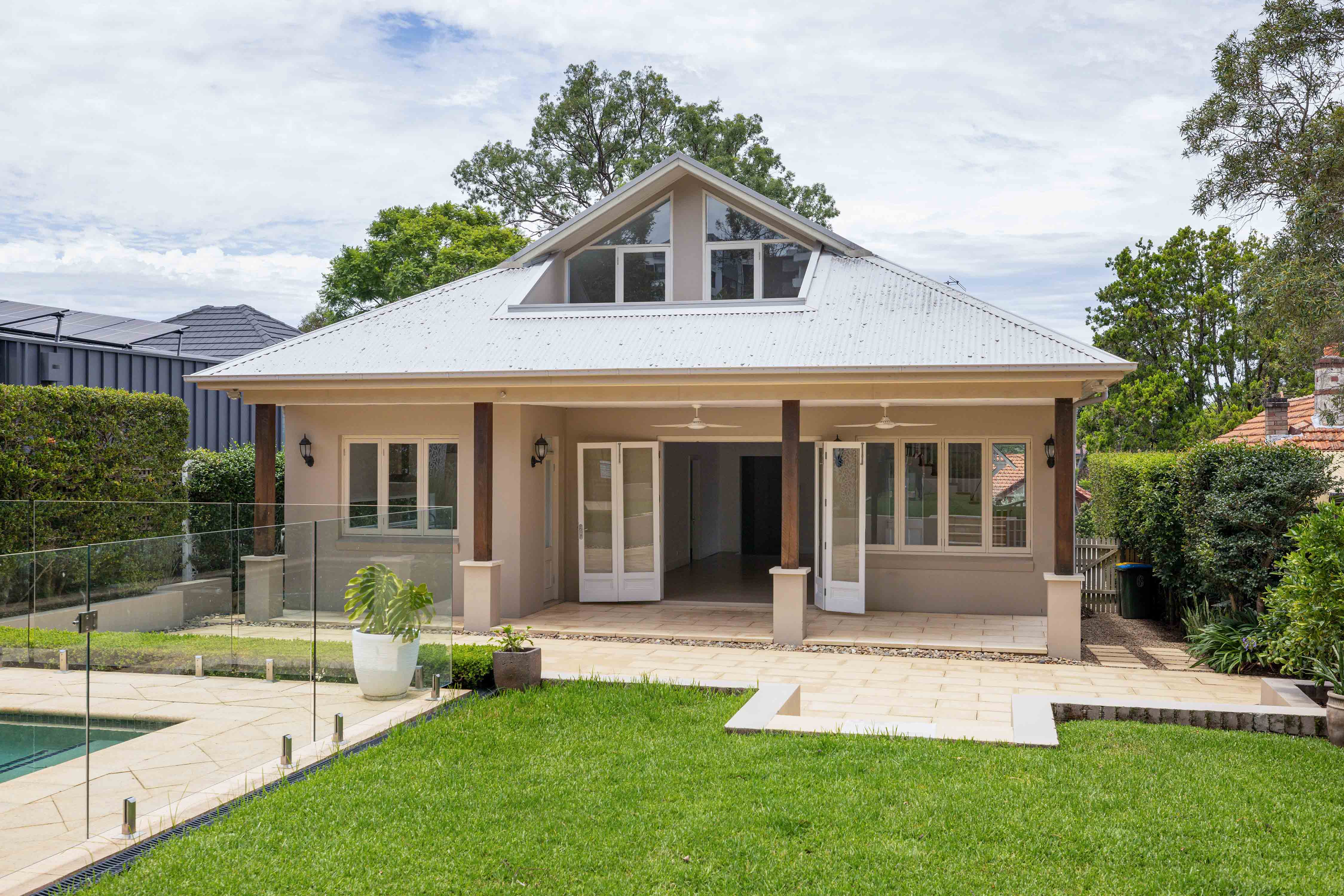 - Paved alfresco terrace, solar panels, pool
