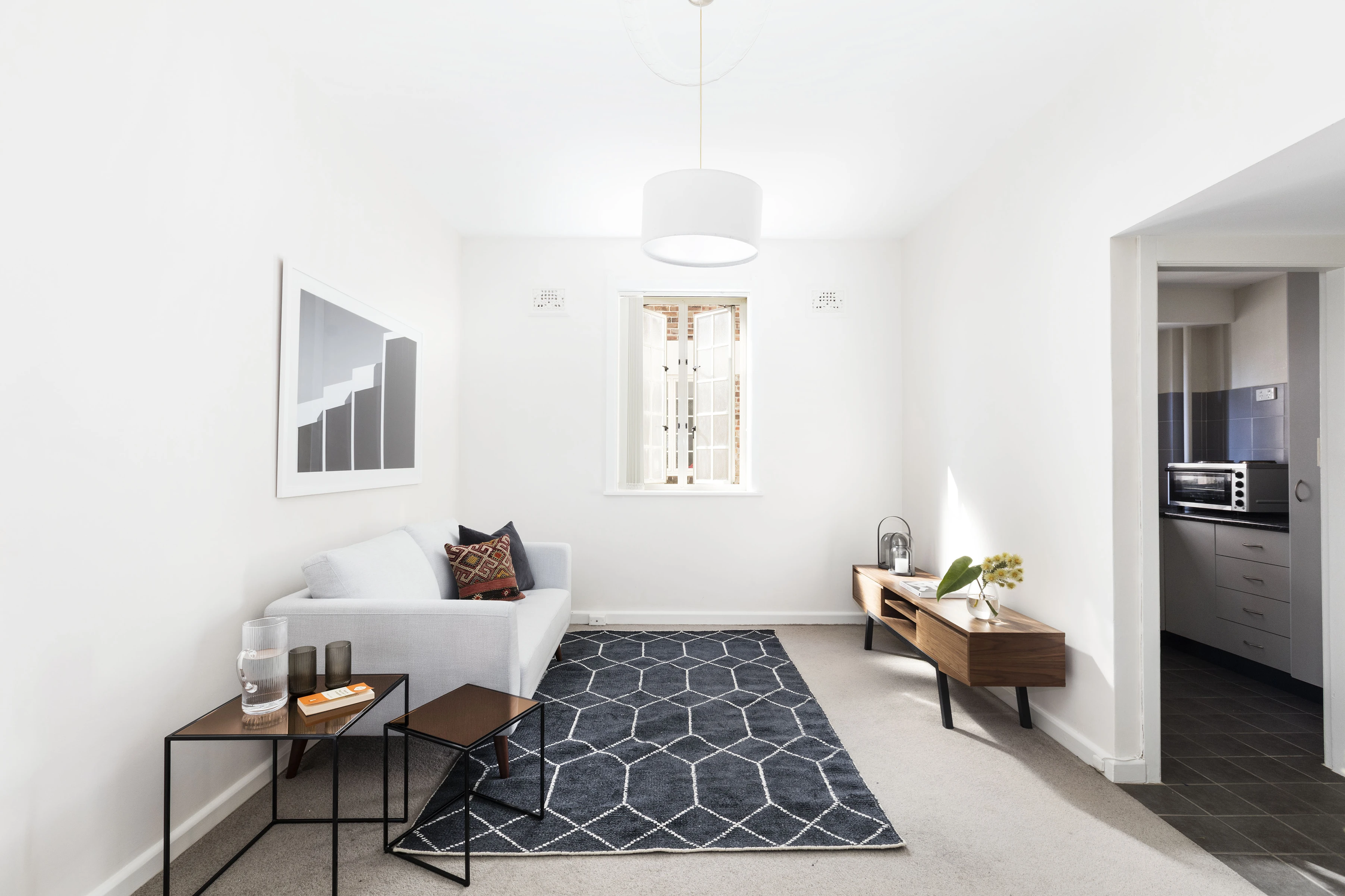 - Tidy stone kitchen, tiles & carpet