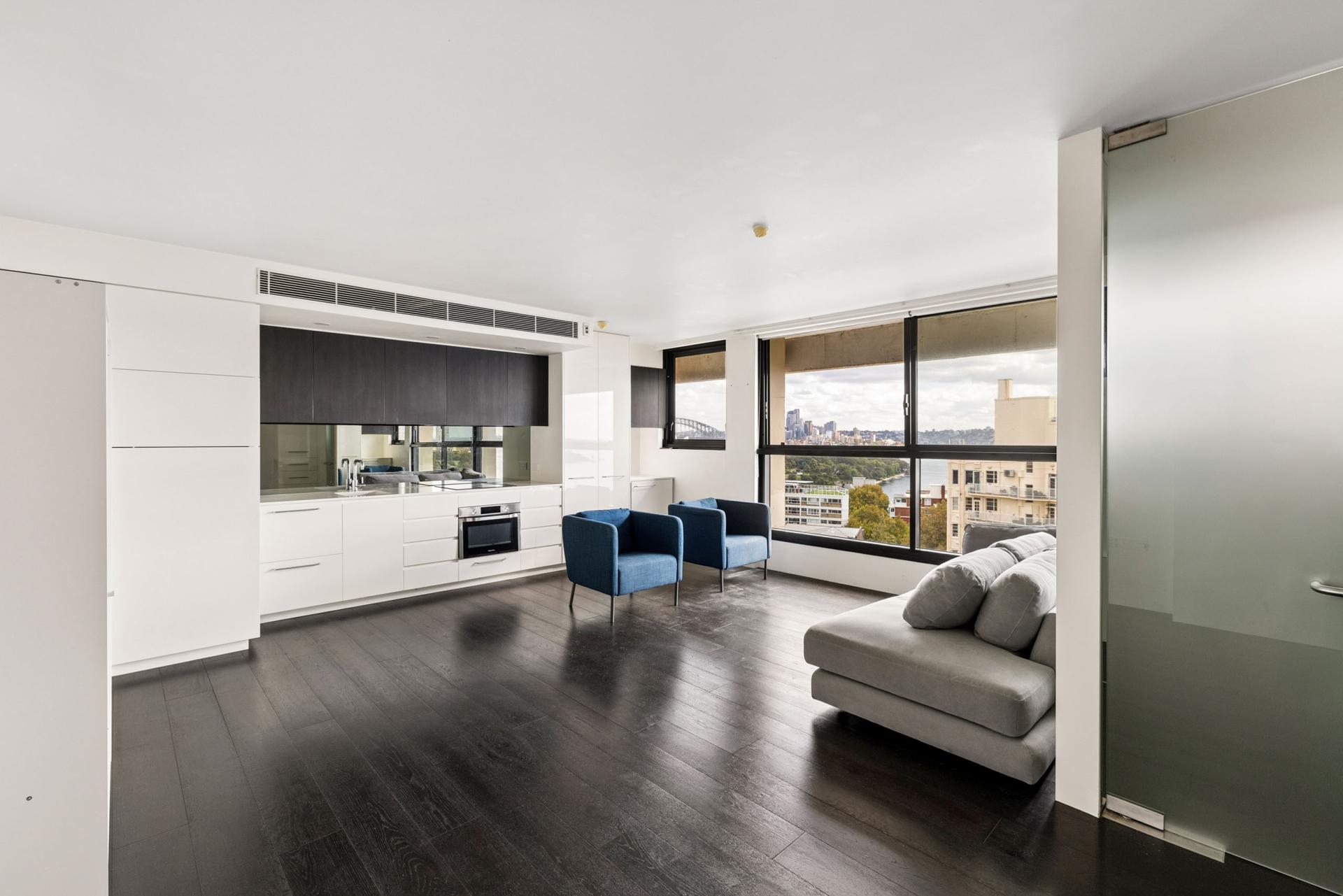 Positioned high within ‘The Chimes’, this smart studio combines timber floors, air conditioning and iconic bridge views in a secure lifestyle setting. Recently refreshed with an updated kitchen and bathroom, it offers a low-maintenance home in a stylishly refurbished building with Potts Point village life, transport and harbourfront walks all close by. Multiple units currently available in the building with BresicWhitney. 6-month lease only.