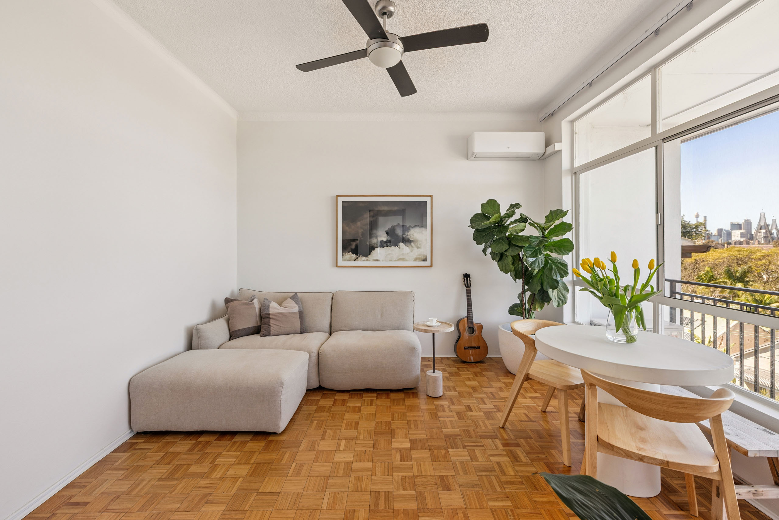 - Parquet floors, split air con, ceiling fans