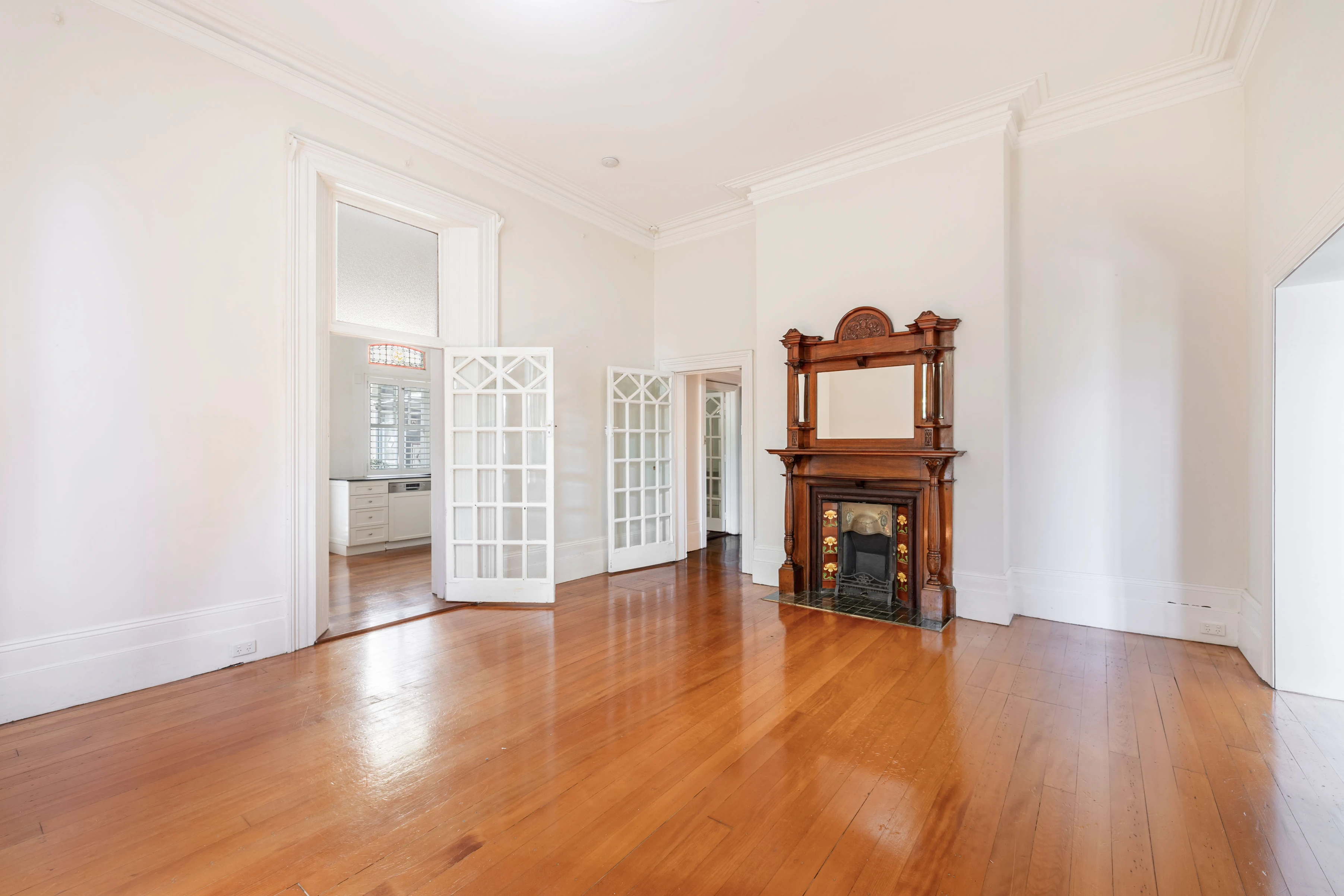 - Expansive living space with ornate fireplace