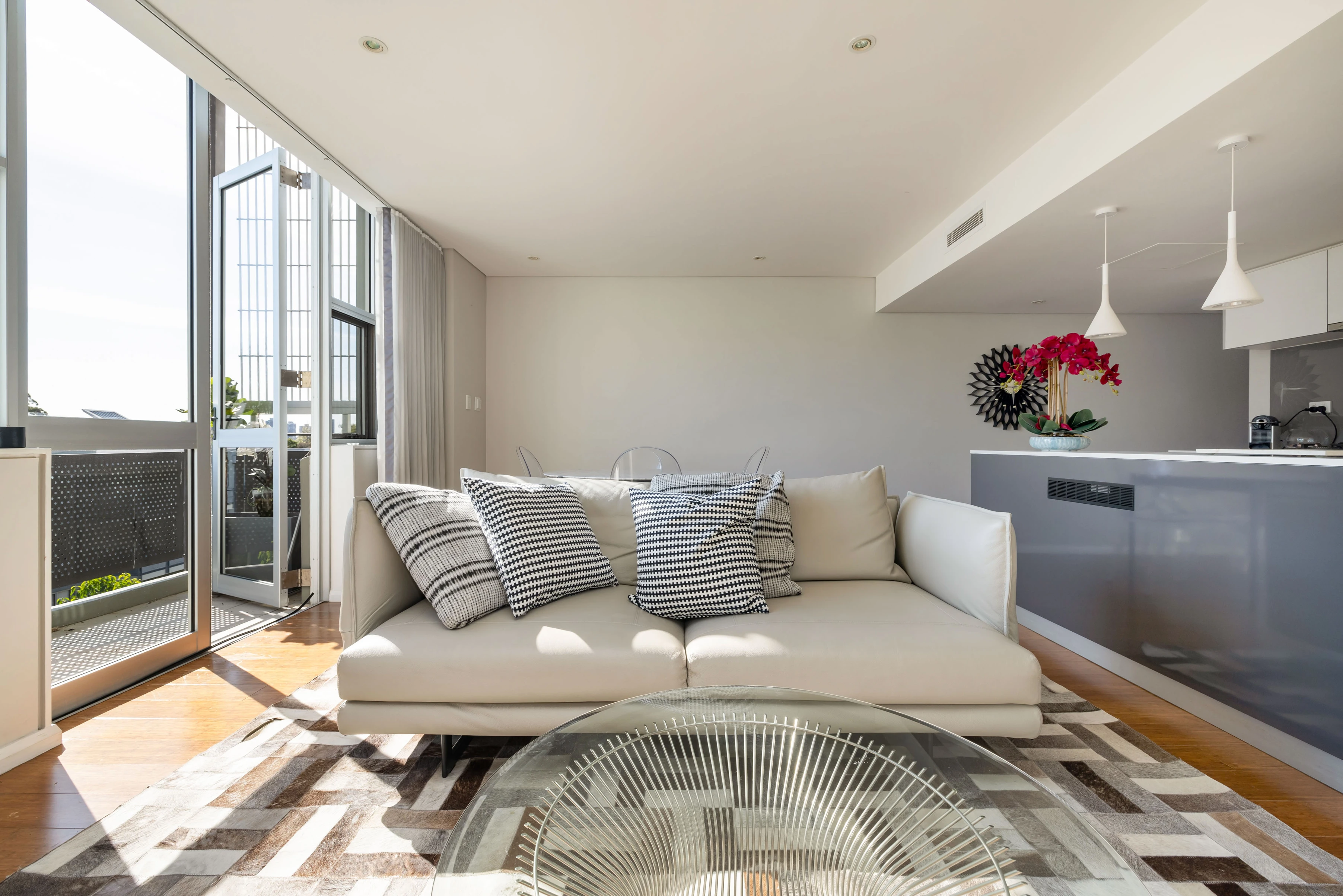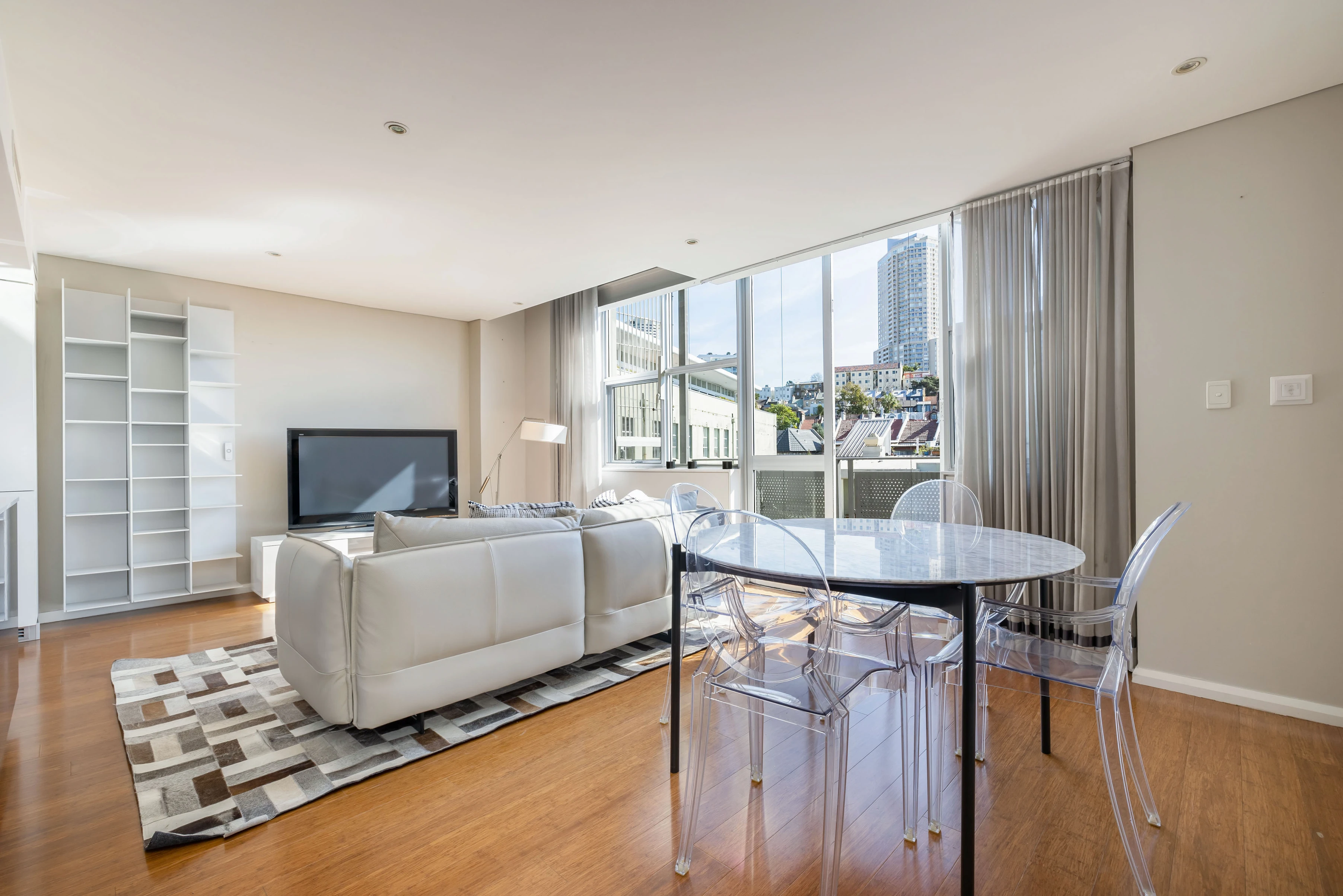 - Open plan living/dining area with balcony