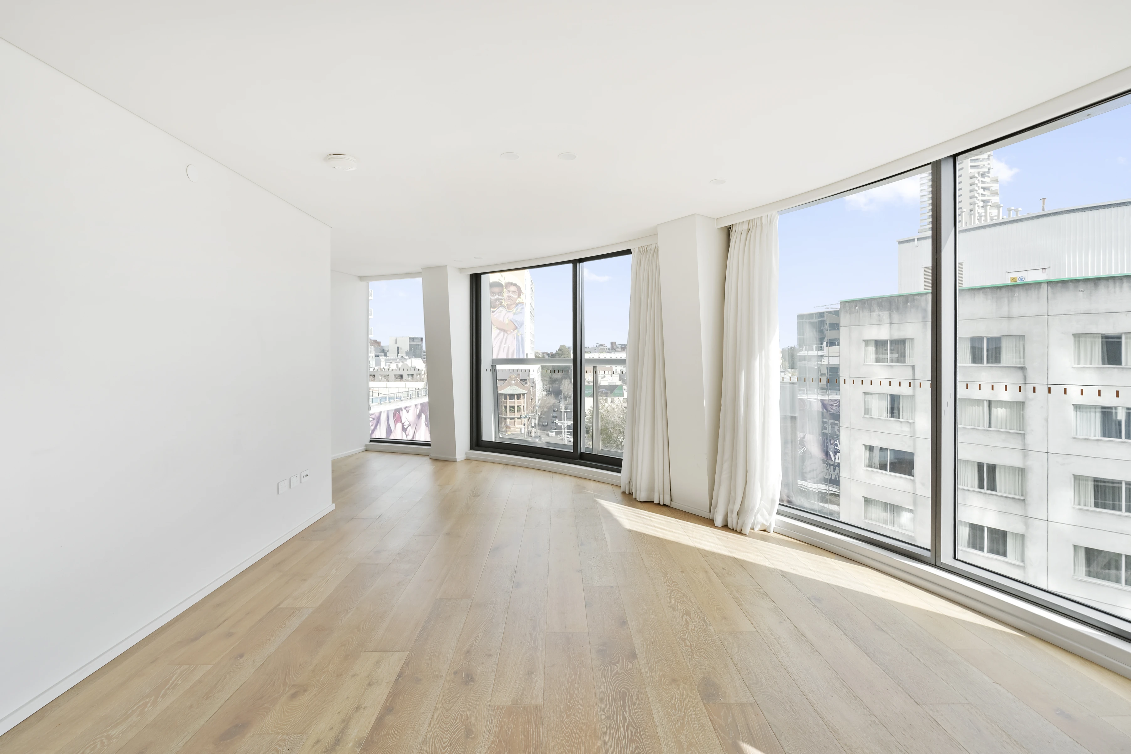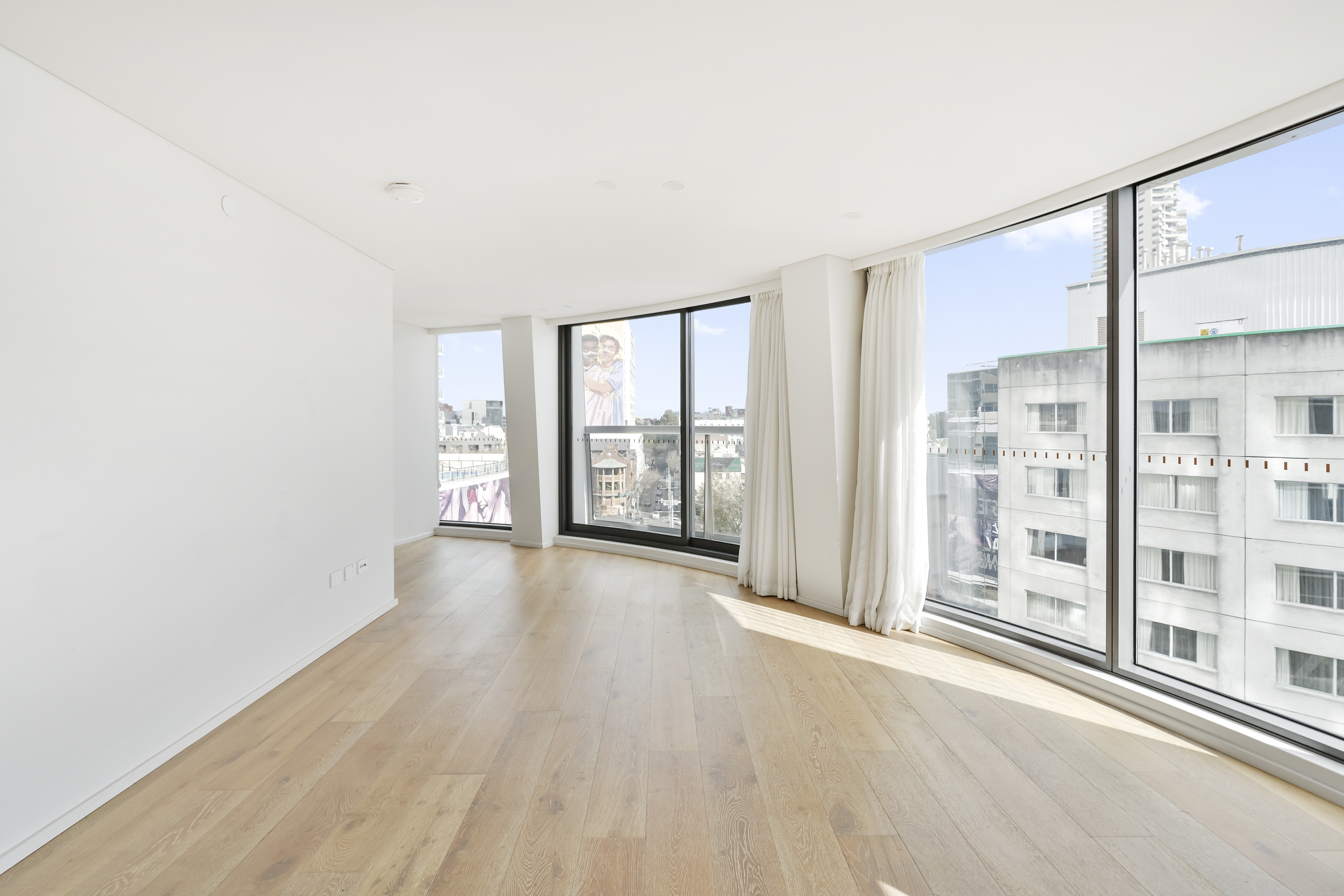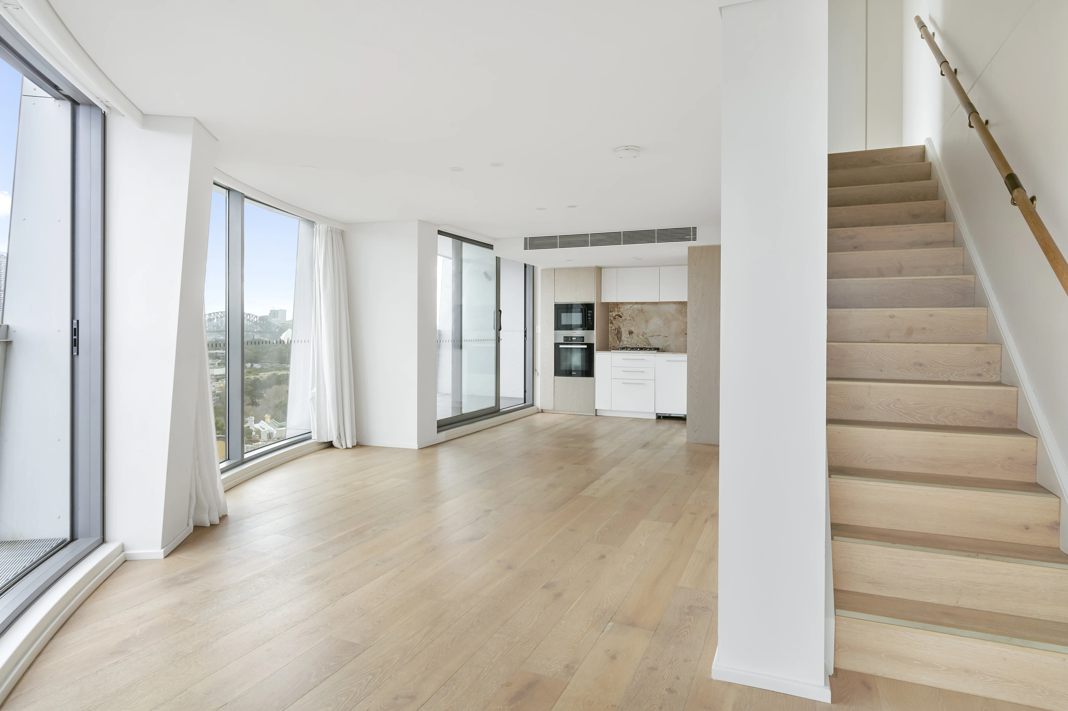 This dual-level apartment in the Omnia building offers stunning views of Sydney's skyline, Harbour Bridge, Opera House, and Darlinghurst, featuring curved glass-walled interiors, living and dining areas, double-sized bedrooms with en-suites, an open-plan kitchen, and multiple balconies. Additional amenities include air conditioning and video intercom. The building, designed by Durbach Block Jagger and SJB, features a marble foyer, 24-hour concierge, residents' wine room, and retail levels including a Woolworths Metro supermarket, providing convenient luxury urban living in a prime location.
