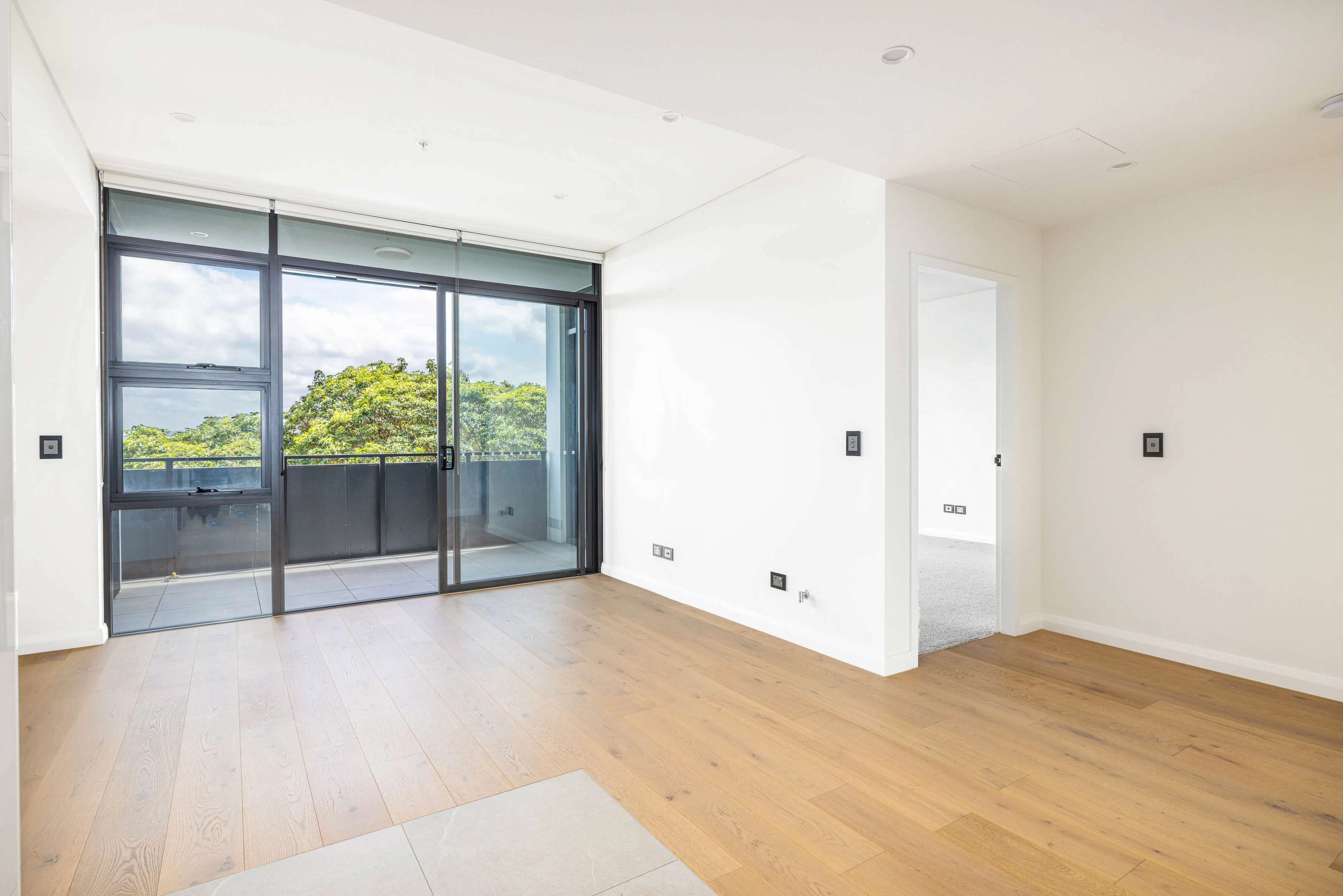 - Open-plan living with wood flooring